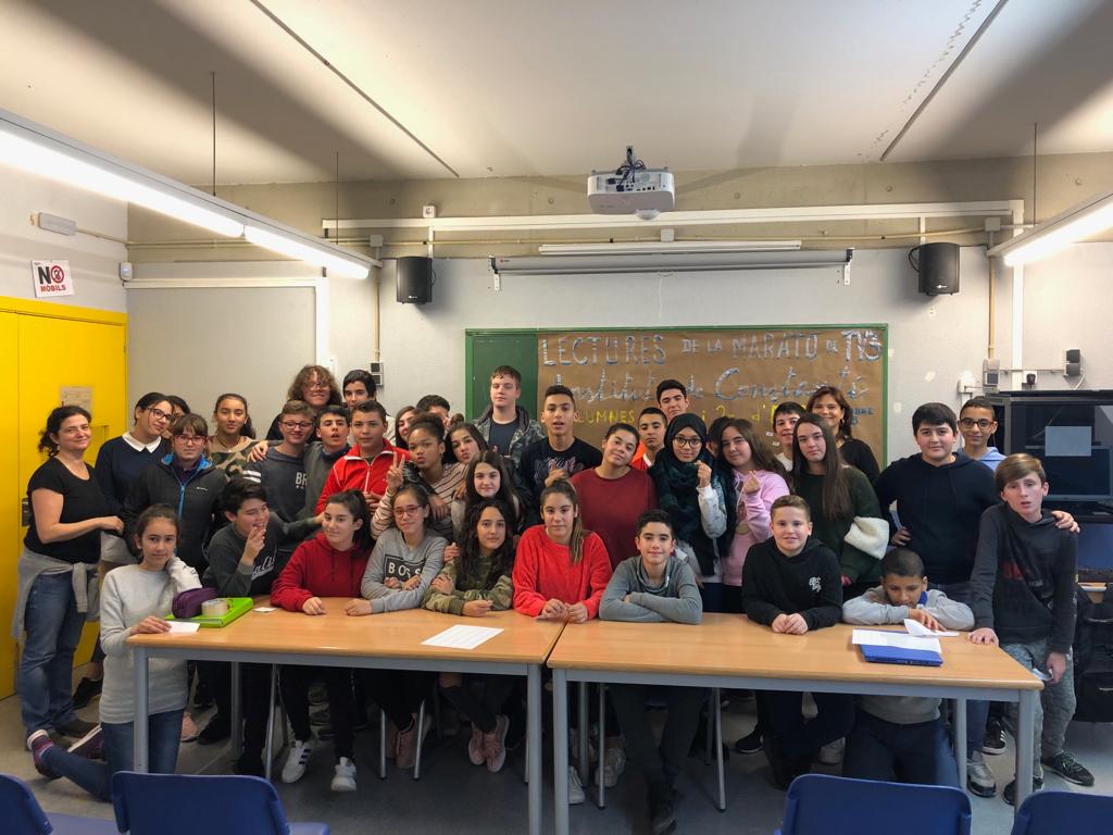 El passat dijous 13 de desembre, l’alumnat de 1r i 2n d’ESO (un total de 88 alumnes) van participar en l’activitat “Lectures solidàries” en el marc de la Marató que enguany vol finançar projectes d’investigació contra el càncer. El nostre alumnat havia d’anar a la Biblioteca per fer la lectura, però atès que el temps meteorològic no ens va acompanyar, la lectura es va portar a terme a la sala d’audiovisuals.