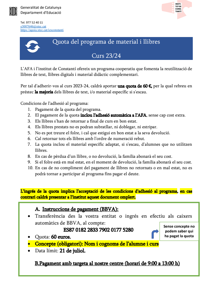 - Cal fer efectiva tant la quota de centre, com la quota de participació al programa de llibres de l’Institut de Constantí abans del 21 de juliol.