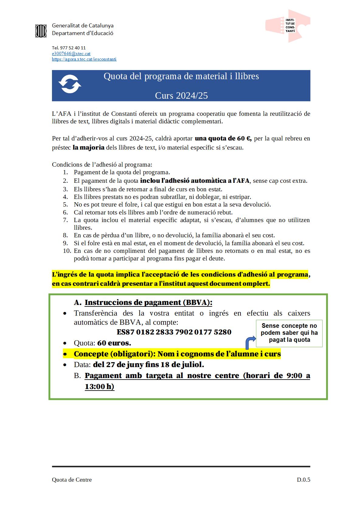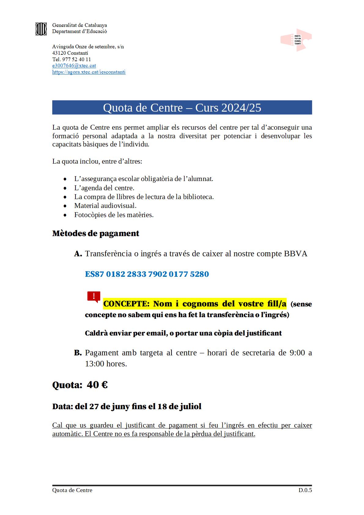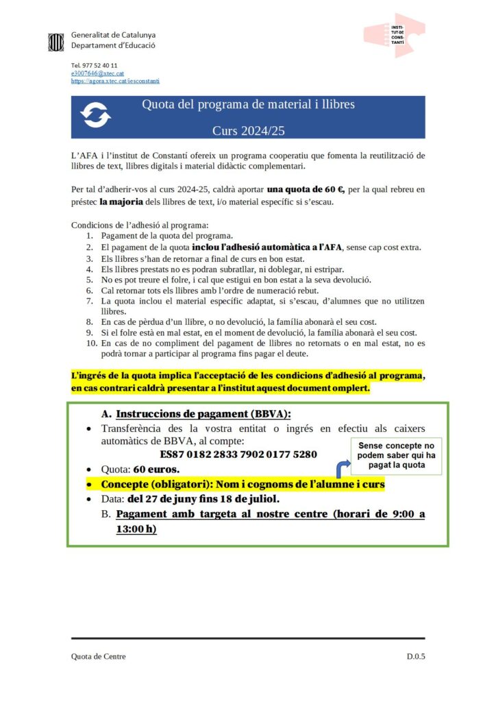• Cal fer efectiva tant la quota de centre, com la quota de participació al programa de llibres de l’Institut de Constantí des del 27 de juny fins al 18 de juliol.