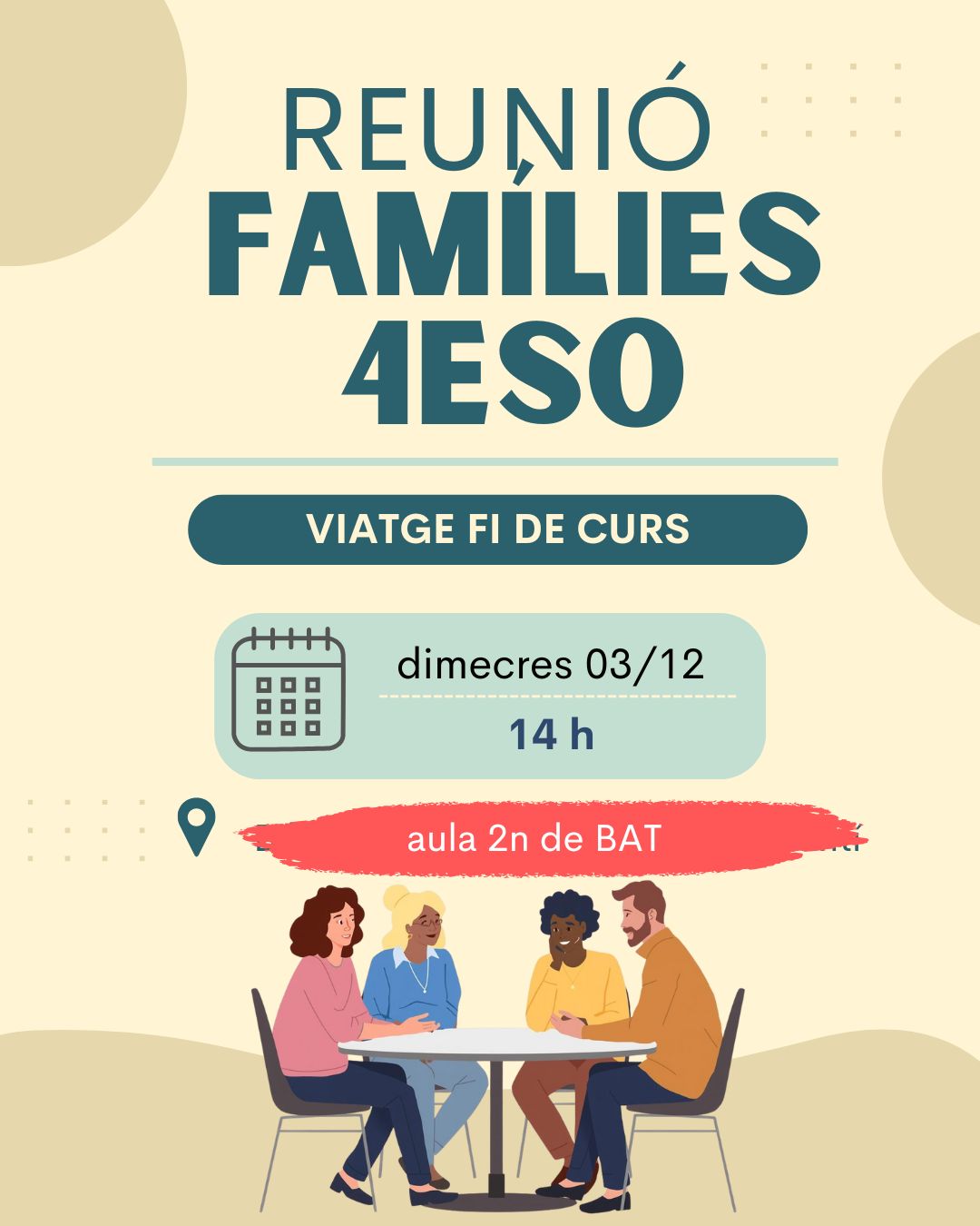 Aquest dimecres 3 de desembre, farem una reunió informativa per a les famílies de 4t d’ESO de l’alumnat que va al viatge de fi de curs. La reunió serà a les 14 h A L’AULA DE 2N DE BATXILLERAT.