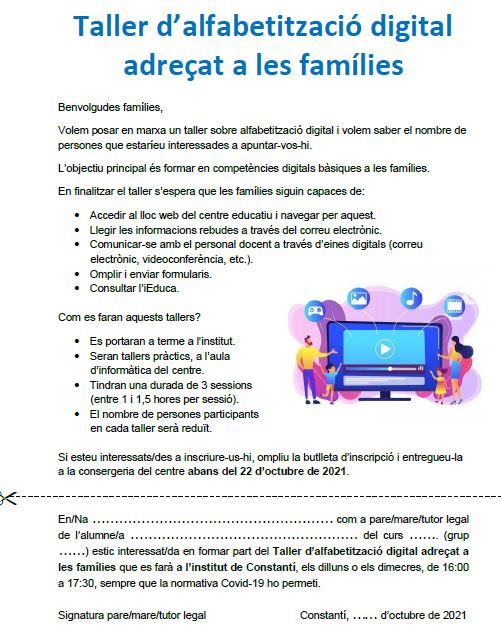 Si esteu interessats, podeu baixar-vos el document (aquí) i lliurar-lo a la consergeria del centre. En cas que no el pugueu imprimir, podeu passar per l’institut i us el facilitarem.