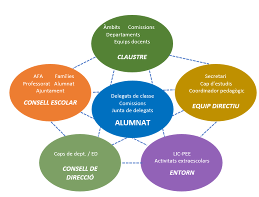 En el centre de les relacions en xarxa s’hi troba l’alumnat, que a la vegada participa en la gestió de centre mitjançant la Junta de delegats, les comissions (com la “Lila” que treballa la perspectiva de gènere) i el Consell Escolar, amb els seus representants del sector alumnat.
