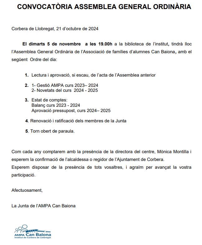 Assemblea de l’Afa Can Baiona Feu un comentari / Per AFA Can Baiona / 31/10/2024 / AFA / AFA, ampa, Assemblea
