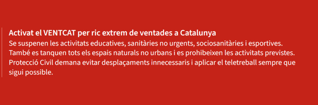 Activat el VENTCAT per ric extrem de ventades a CatalunyaSe suspenen les activitats educatives, sanitàries no urgents, sociosanitàries i esportives. També es tanquen tots els espais naturals no urbans i es prohibeixen les activitats previstes. Protecció Civil demana evitar desplaçaments innecessaris i aplicar el teletreball sempre que sigui possible. Benvolguts i benvolgudes, Ens acaben d’