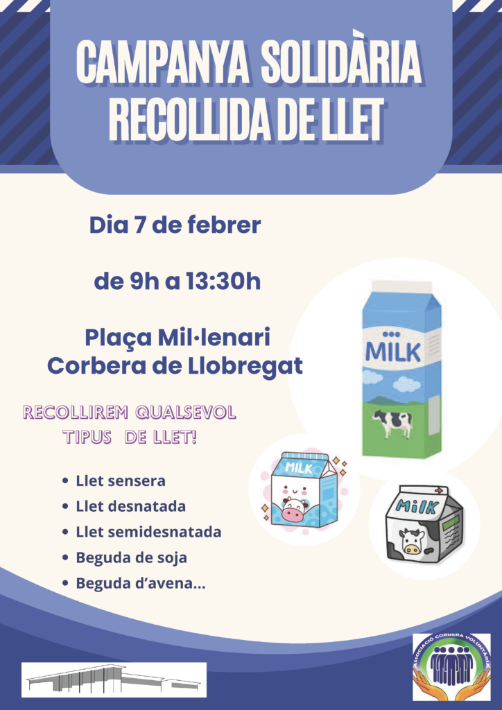 La recollida principal tindrà lloc dissabte 7 de febrer, de 9:00 a 13:30, a la plaça del Mil·lenari de Corbera de Llobregat, on l’alumnat us hi esperarà. Es poden aportar diferents tipus de llet: sencera, semidesnatada o desnatada, així com llet de soja o civada, en pols, etc.