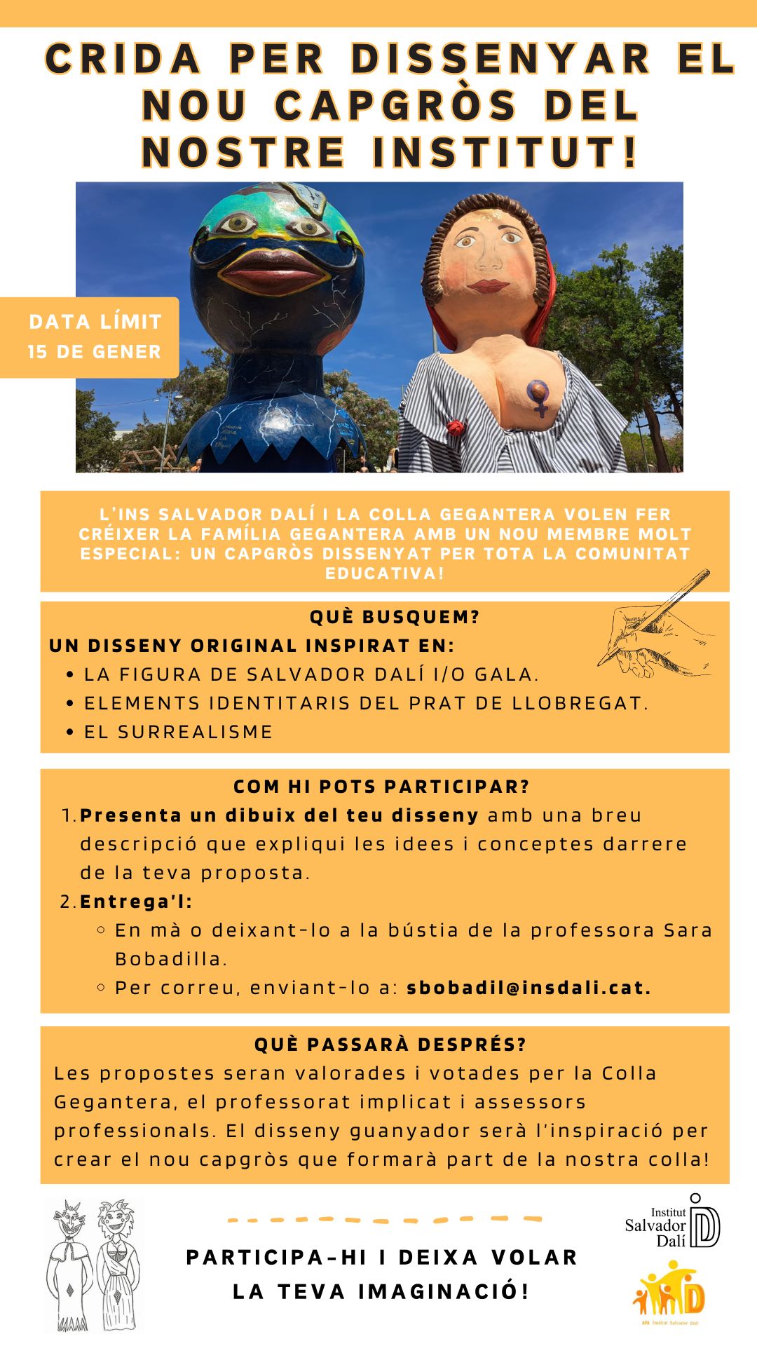 Ja fa anys que els nostres gegants, la Gala i el Sadalí, la ballen. I ara aquesta colla gegantera pot créixer, gràcies a la iniciativa del departament d’expressió artística i la subvenció del projecte per part de l’Ajuntament del Prat.Així, us convidem a participar en el disseny per al nou capgròs de l’institut (les bases en el document adjunt) i aprofitem per animar-vos a participar amb els vostres fills i filles en les sortides de la colla gegantera.Moltes gràcies per la vostra col·laboració.
