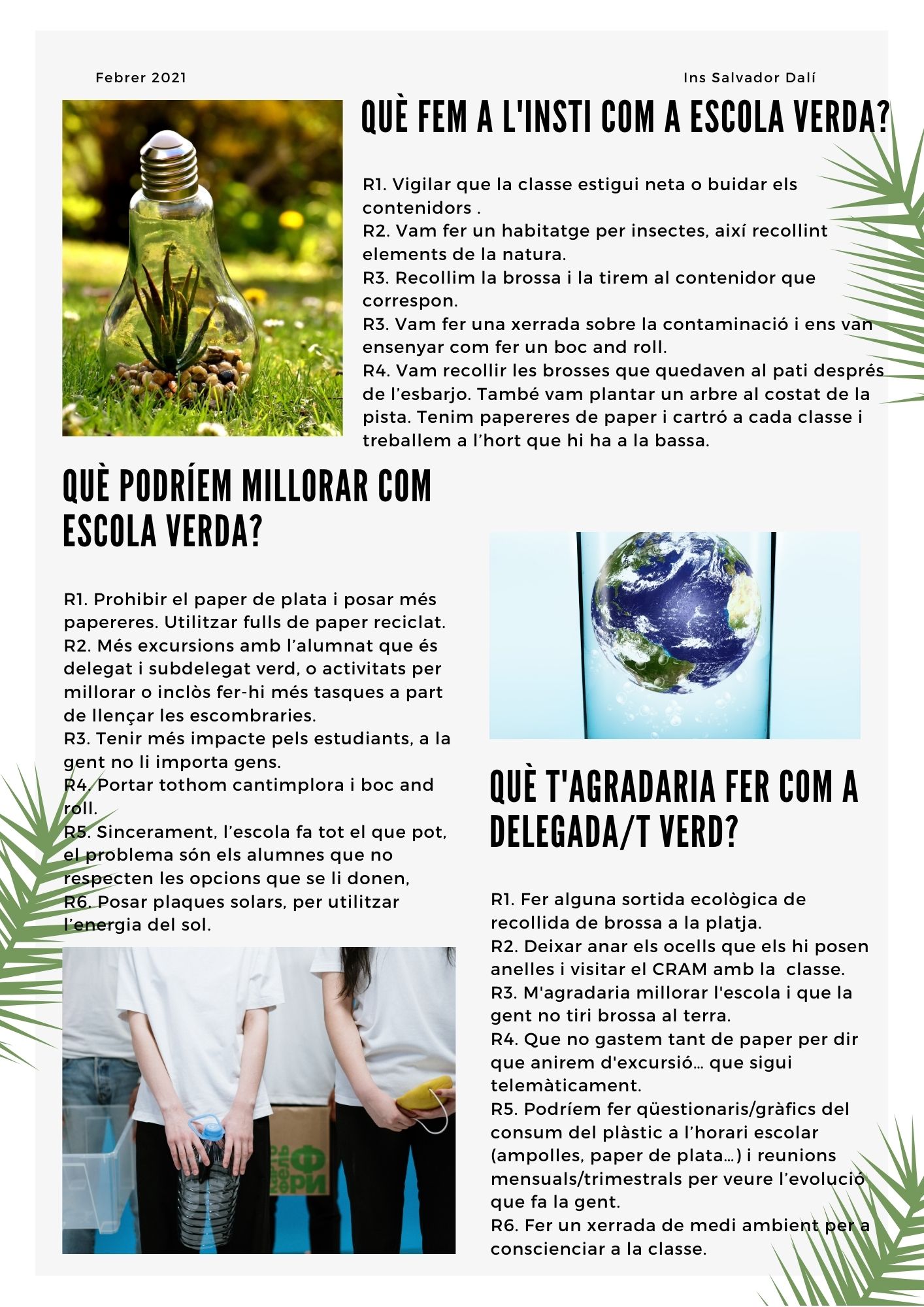 Amb aquest objectiu, al llarg de tots aquests anys, les nostres delegades i delegats verds han participat i participen en diferents accions, tant a l’Institut com en el nostre entorn més proper (platja, espais naturals,…), per tal de fomentar valors de respecte i consciència ambiental.