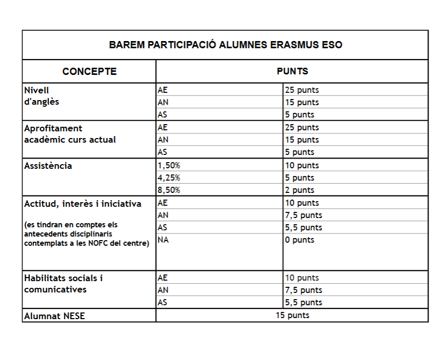 Barem de participació alumnes ERASMUS ESO: