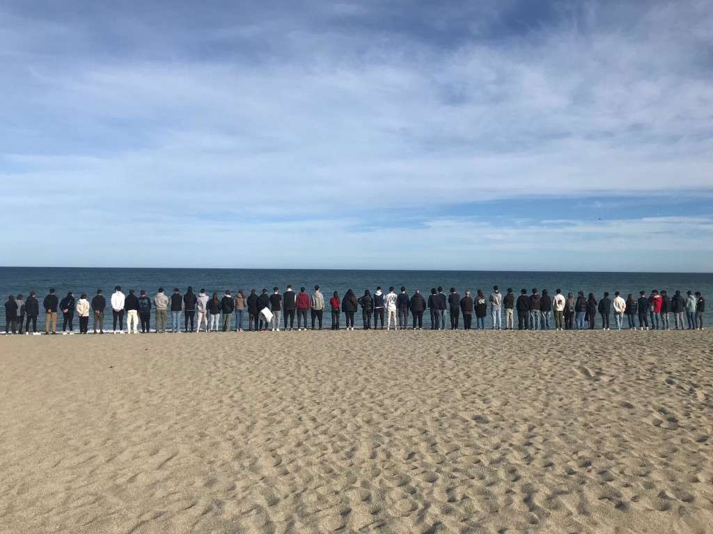 Imatge del minut de silenci a la platja d’Argelers en record de tots aquells exiliats -dones, homes i nens- de la Guerra Civil Espanyola.