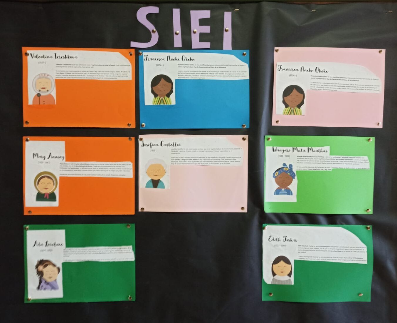 Per últim, l’alumnat dels SIEI també han volgut participar d’aquest dia investigant i elaborant un pòster sobre dones que han tingut un paper rellevant el darrer segle en l’à mbit de les ciències. Entre moltes dones han investigat sobre l’astronauta Valentina Tereshkova que va ser la primera dona a viatjar a l’espai, la cientÃfica Francisca Nneke Okeke professora de fÃsica a la Universitat de Nigèria i primera dona Cap de Departament de FÃsica de la Universitat o la paleontòloga Mary Anning que va ser clau en el descobriment de fòssils d’espècies mai conegudes fins al moment com l’ictiosaure, o el plesiosaure.