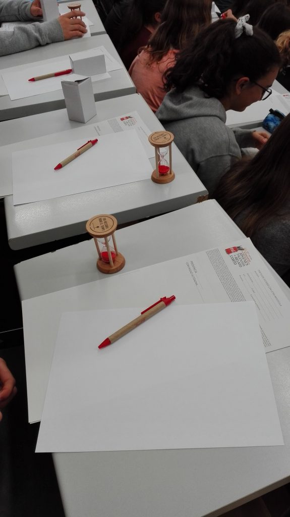 El tema de redacció tenia com a pretext un rellotge de sorra que cada estudiant trobava sobre la seva taula i en què hi havia gravada una frase que havia d’aparèixer en el text: “ERA NECESARIO PARAR EL TIEMPO”. Els alumnes van sortir molt contents i satisfets de l’activitat que van fer entre una hora i mitja i dues hores. Aquesta sensació ja és un premi personal, però esperem que d’aquí unes setmanes algú d’ells rebi un dels premis provincials i qui sap si anirà a la fase autonòmica.