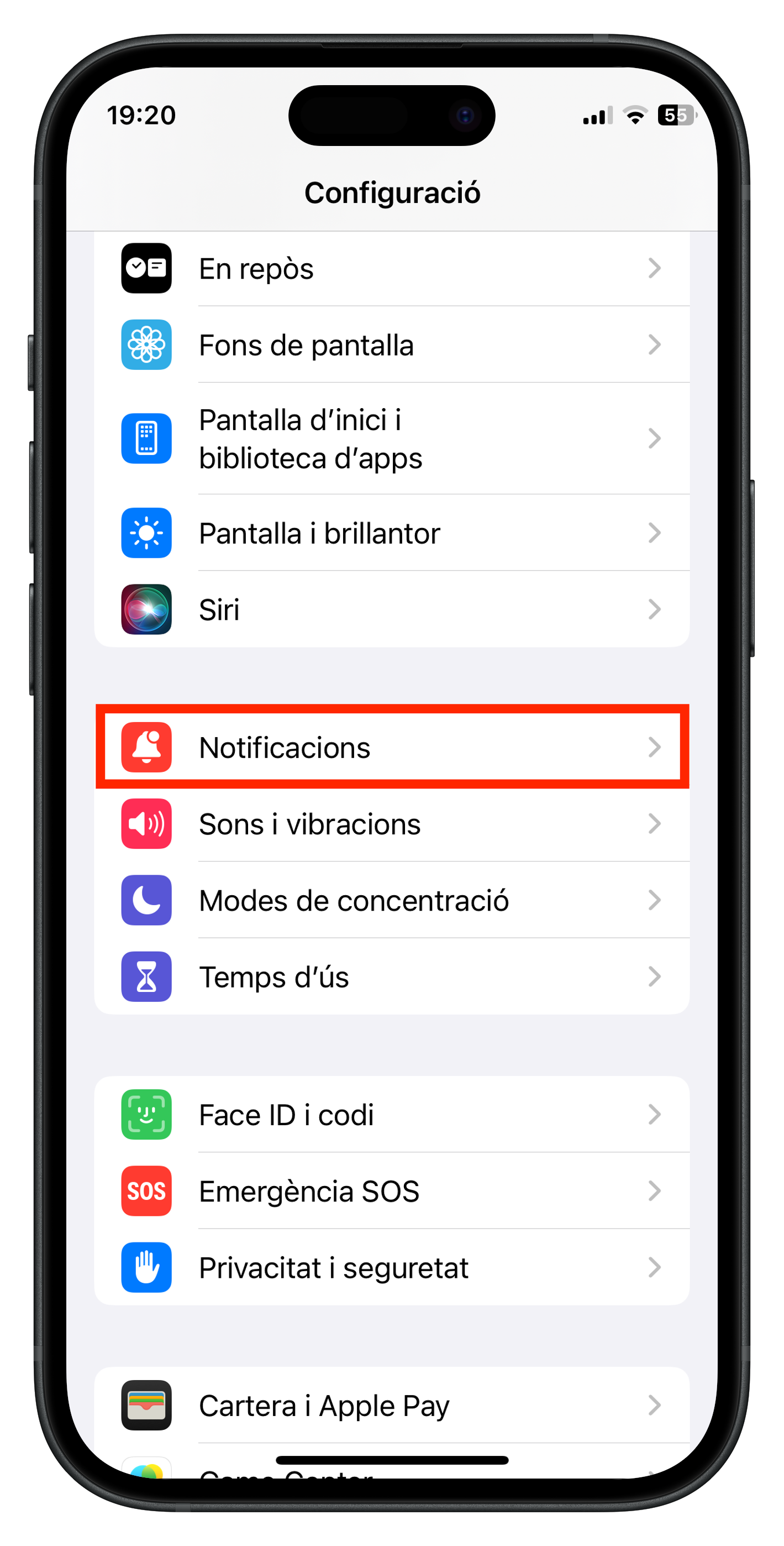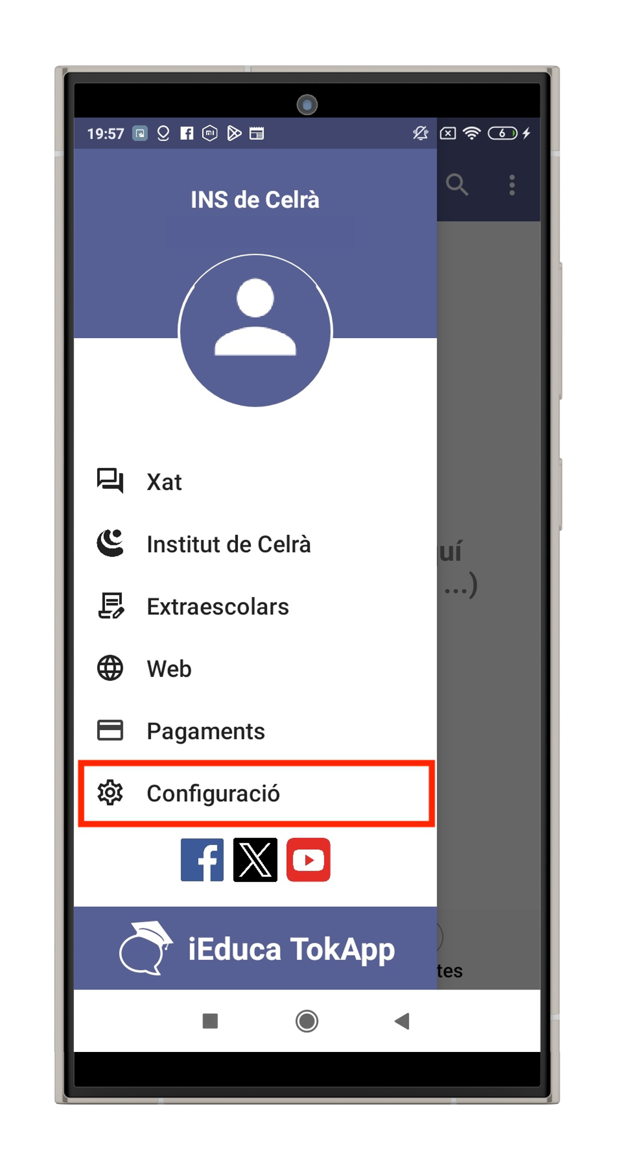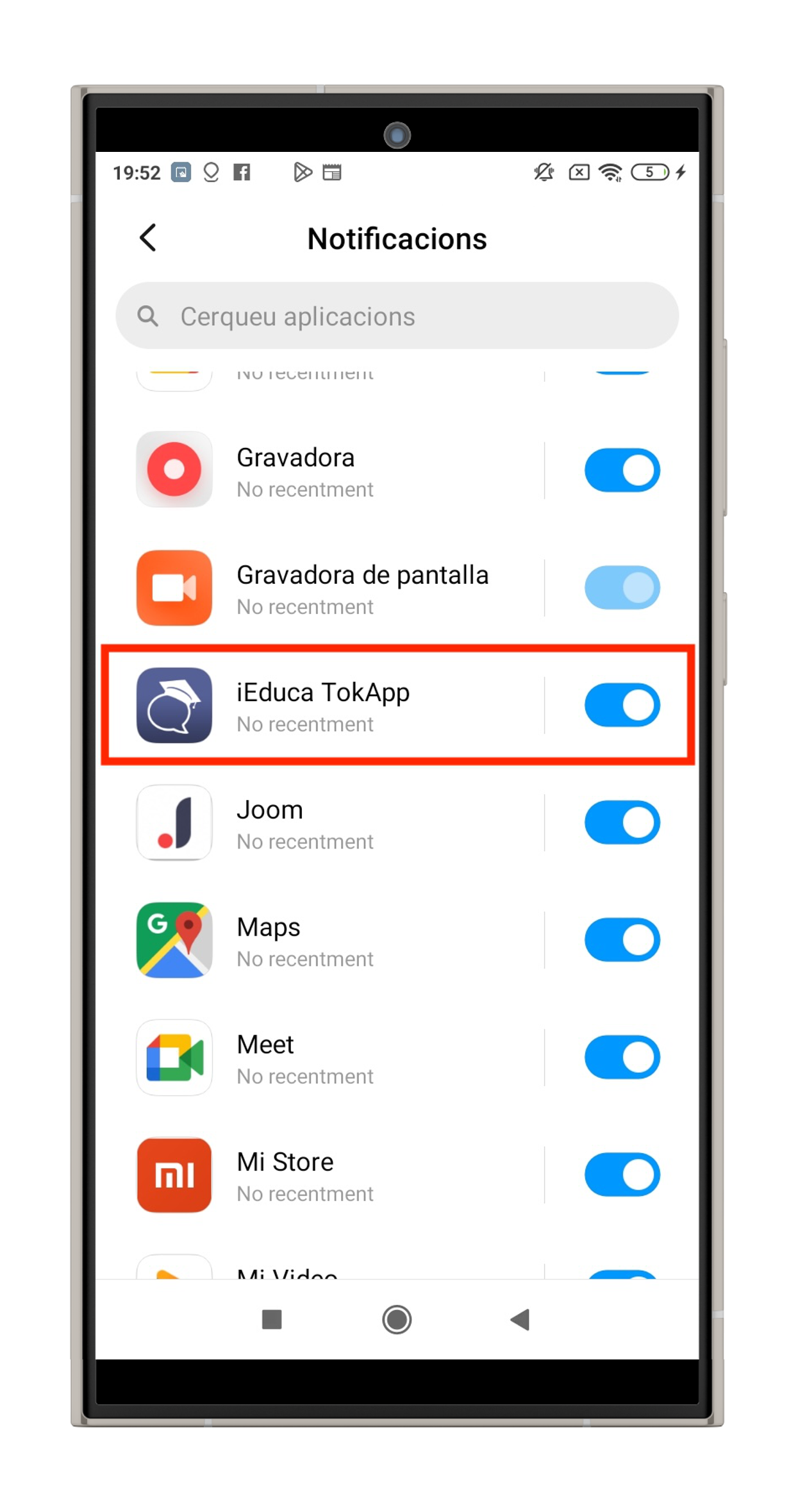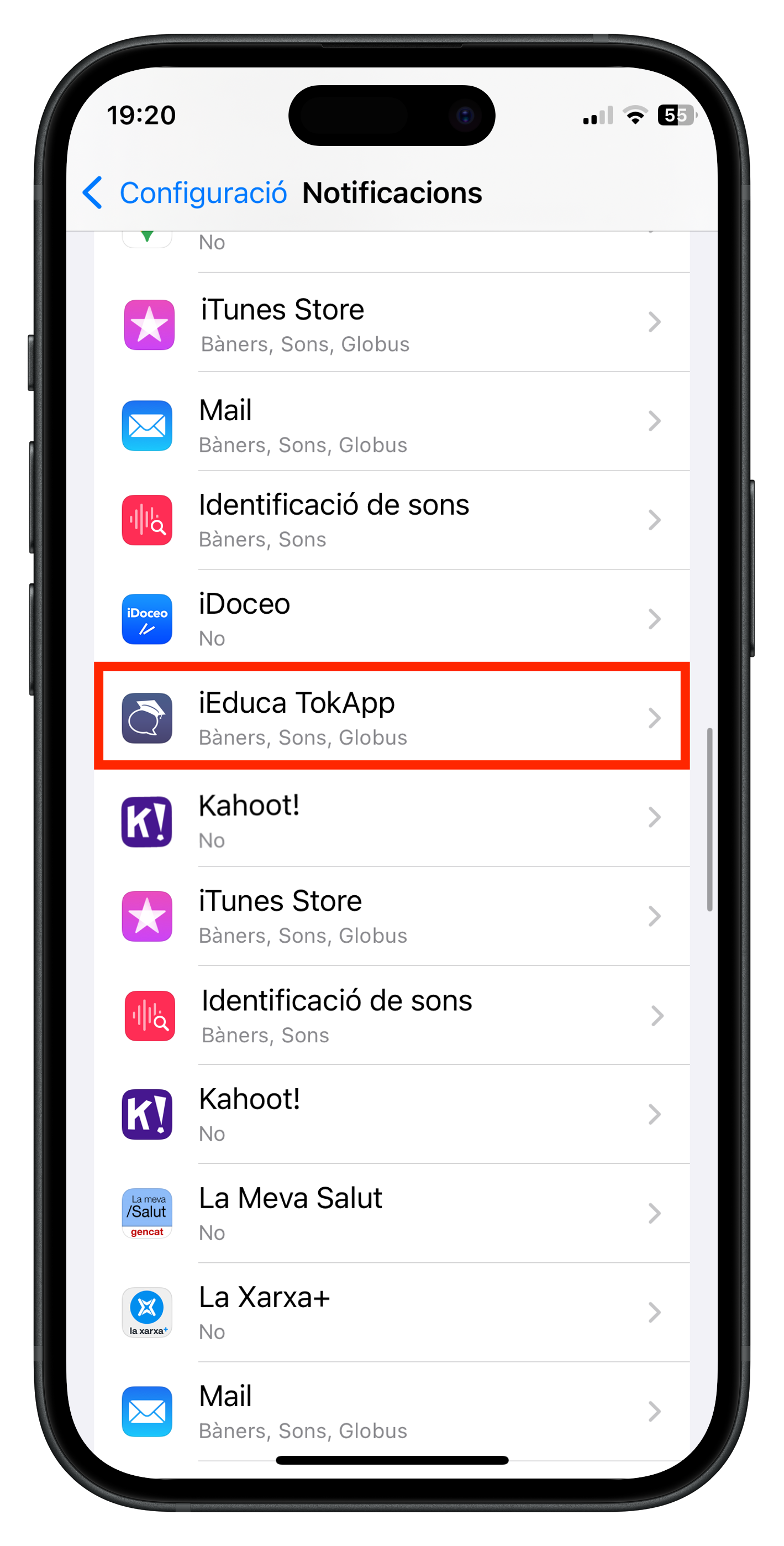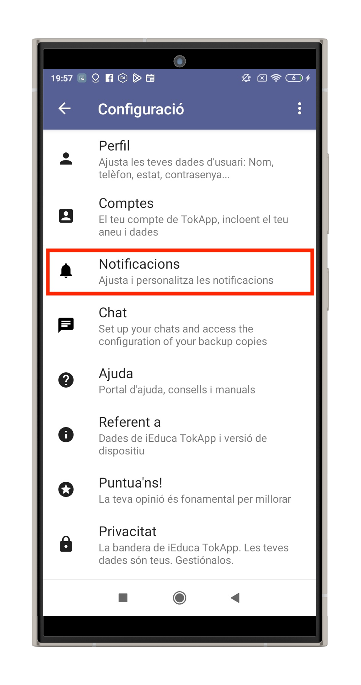 - PAS 2 – Activar les notificacions del telèfon: Aneu a la “Configuració” general del vostre telèfon, busqueu l’apartat “Notificacions”, busqueu l’aplicació “iEduca TokApp” i activeu les notificacions.