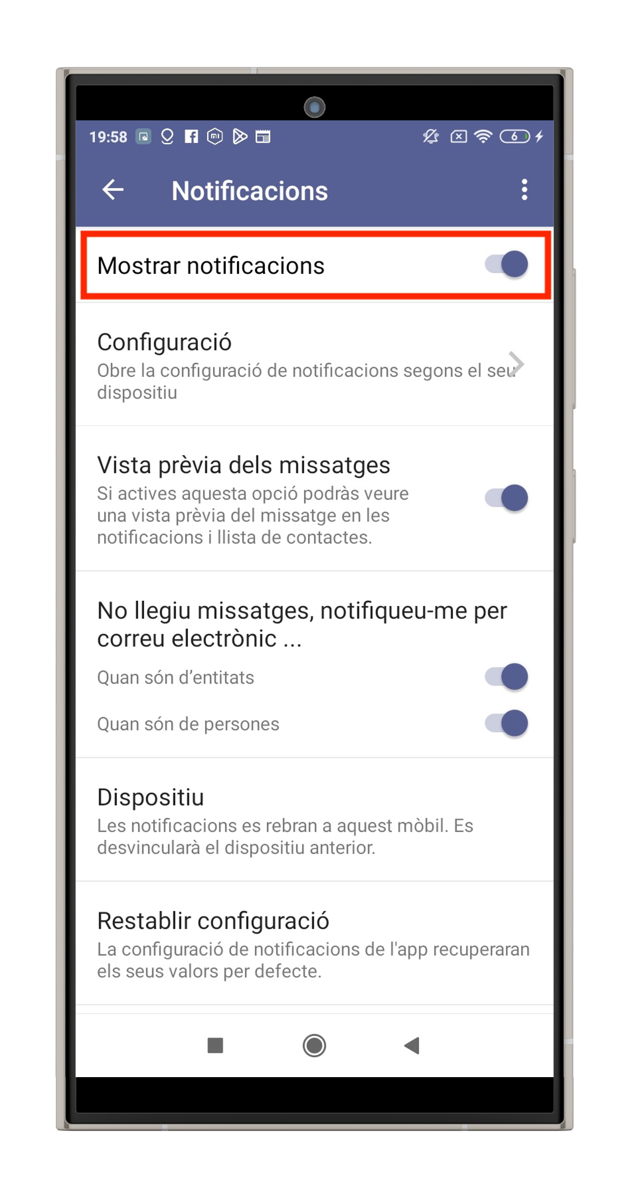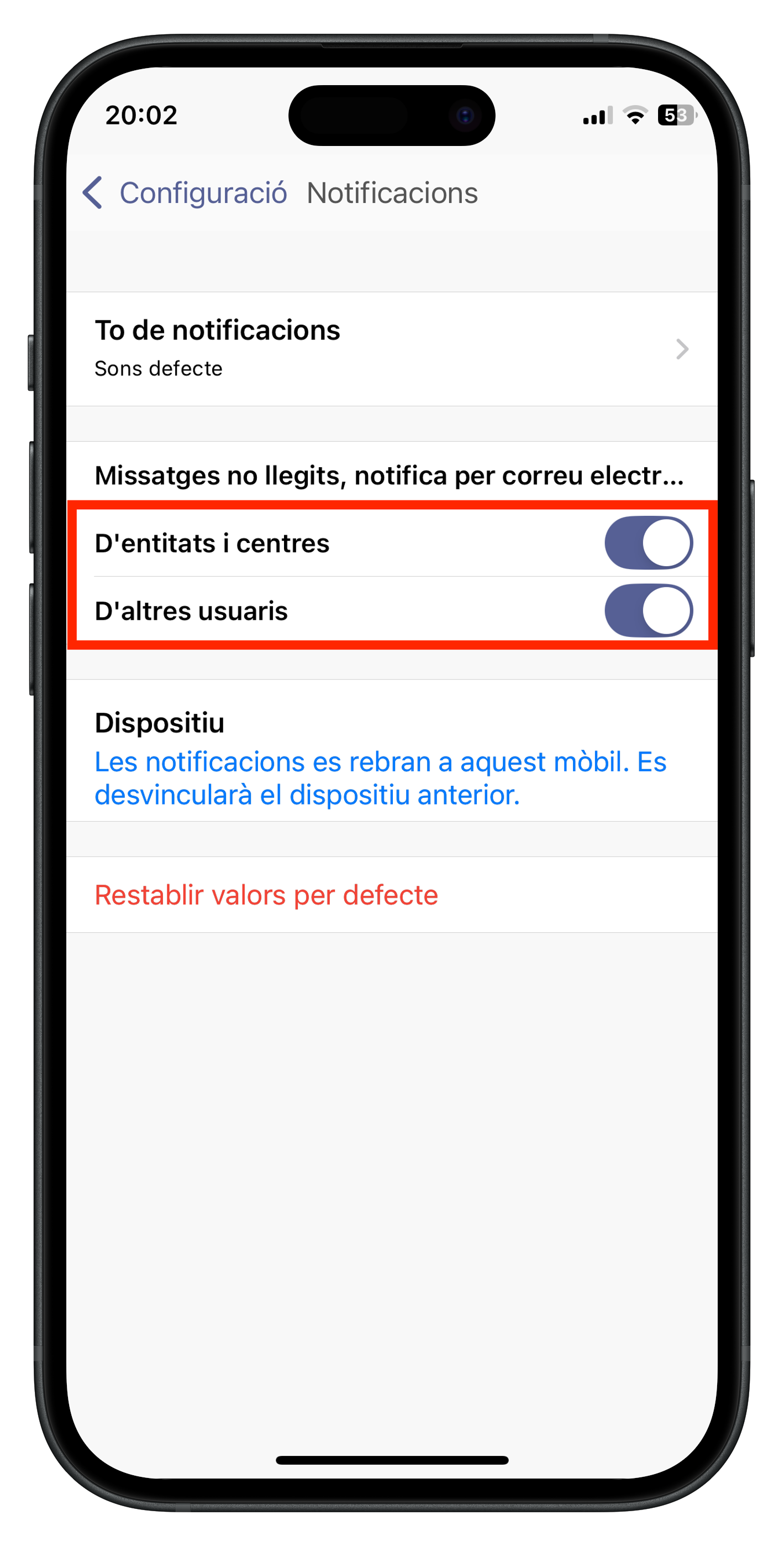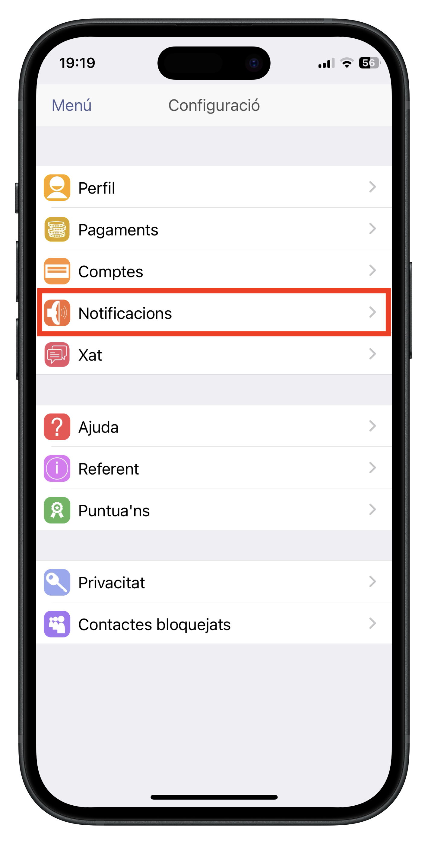 - PAS 1 – Activar les notificacions dins de l’app: Obriu l’aplicació, aneu a “Menú -> Configuració”, feu clic a l’apartat “Notificacions” i assegureu-vos de tenir-les activades.