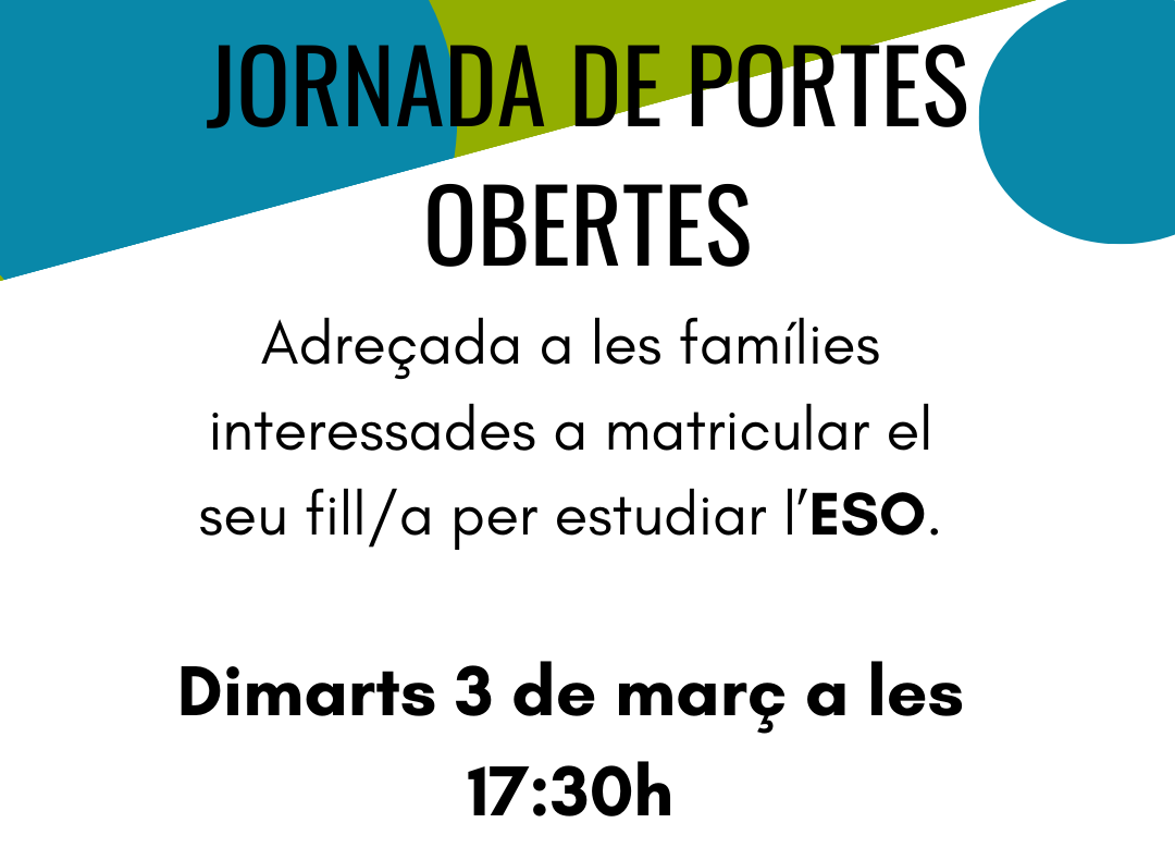 El proper 3 de març a les 17: 30 h tindrà lloc la Jornada de Portes Obertes, adreçada a les famílies interessades a matricular el seu fill/a per estudiar l’ESO.