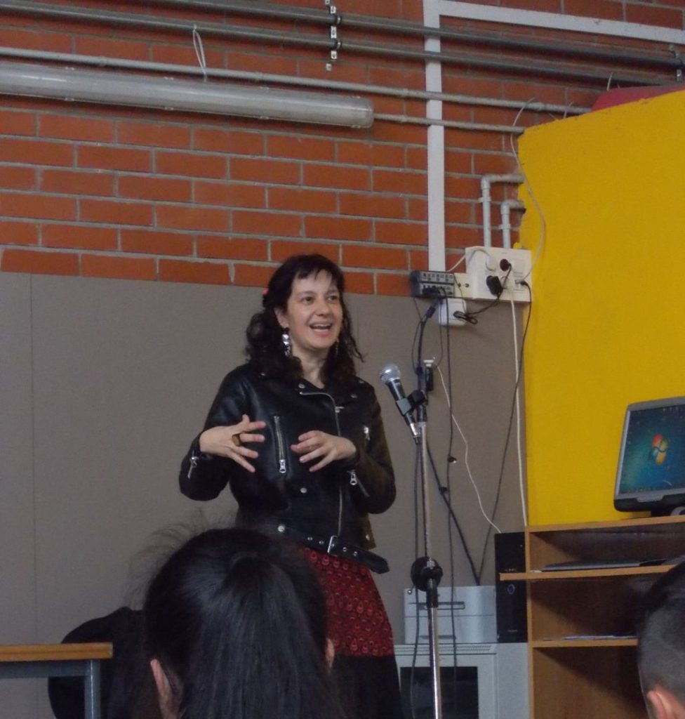 La Laia Aguilar va arribar puntual. Al gimnàs ja l’estàvem esperant, el grup de l’ILEC. La Daniela Morales i la Lluna Jiménez li van donar la benvinguda amb la lectura de la seva presentació.
