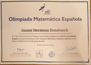 En Jaume Hermosa i Domènech de segon de Batxillerat, després de classificar-se a la fase catalana, ha guanyat la medalla de plata a la fase espanyola de la LXII Olimpiada Matemática Española, que s’ha celebrat a Madrid entre el 12 i el 15 de març. Moltes felicitats!!!