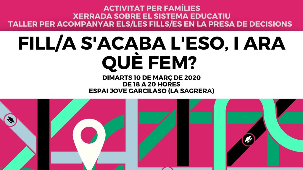 Es tracta d’una activitat gratuïta que forma part de la Campanya In-forma’t 2020 i a on oferim un espai d’assessorament i creixement en què s’explicarà l’estructura del sistema educatiu, les opcions i itineraris que tenen a els i les joves que finalitzen l’ESO, a més de treballar la presa de decisions a través d’un taller dinàmic i veure quin és el rol que les famílies hem d’adoptar en aquest moment vital.
