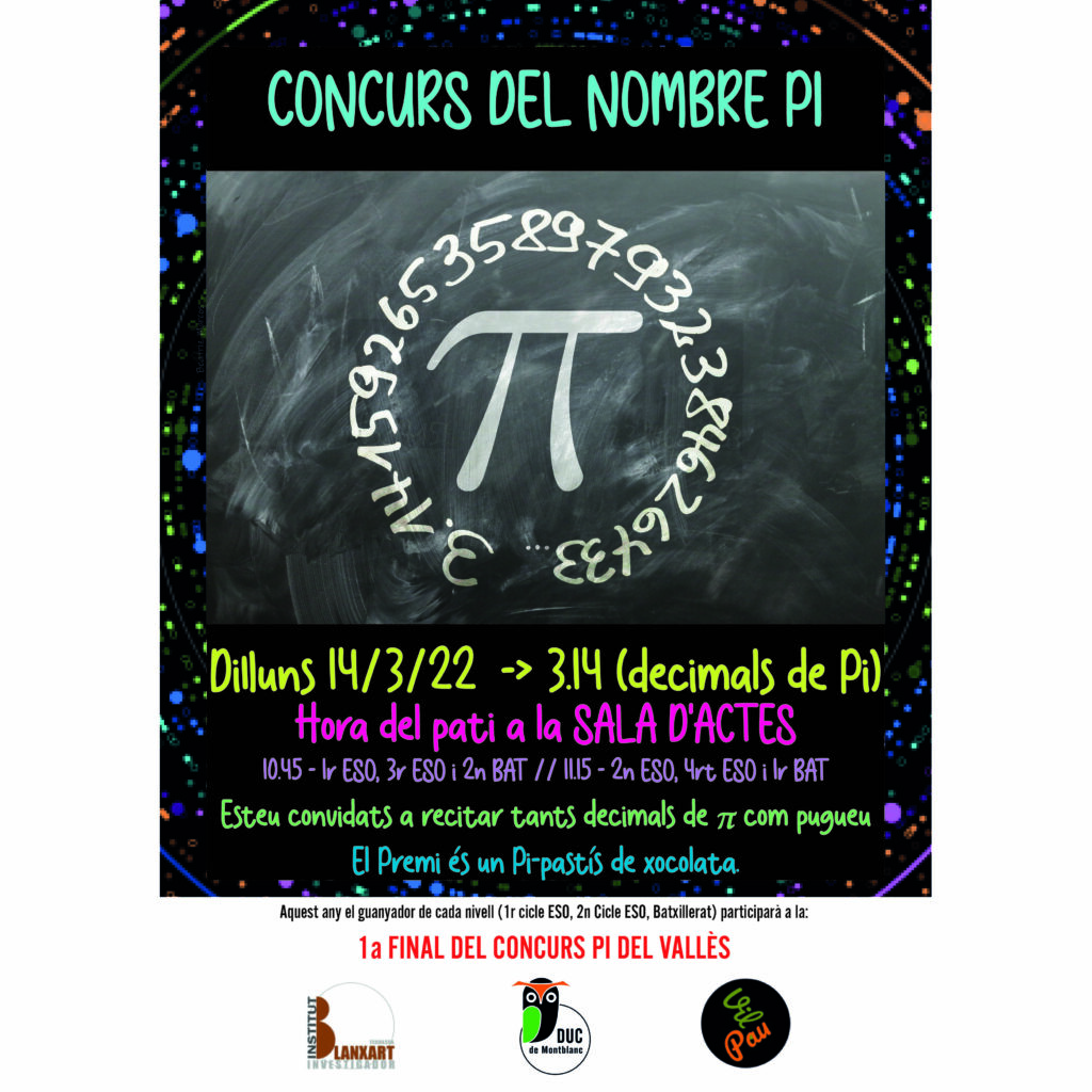 El proper 14 de març se celebrarà el Concurs del Nombre Pi del DUC. Aquest concurs tindrà lloc a l’hora