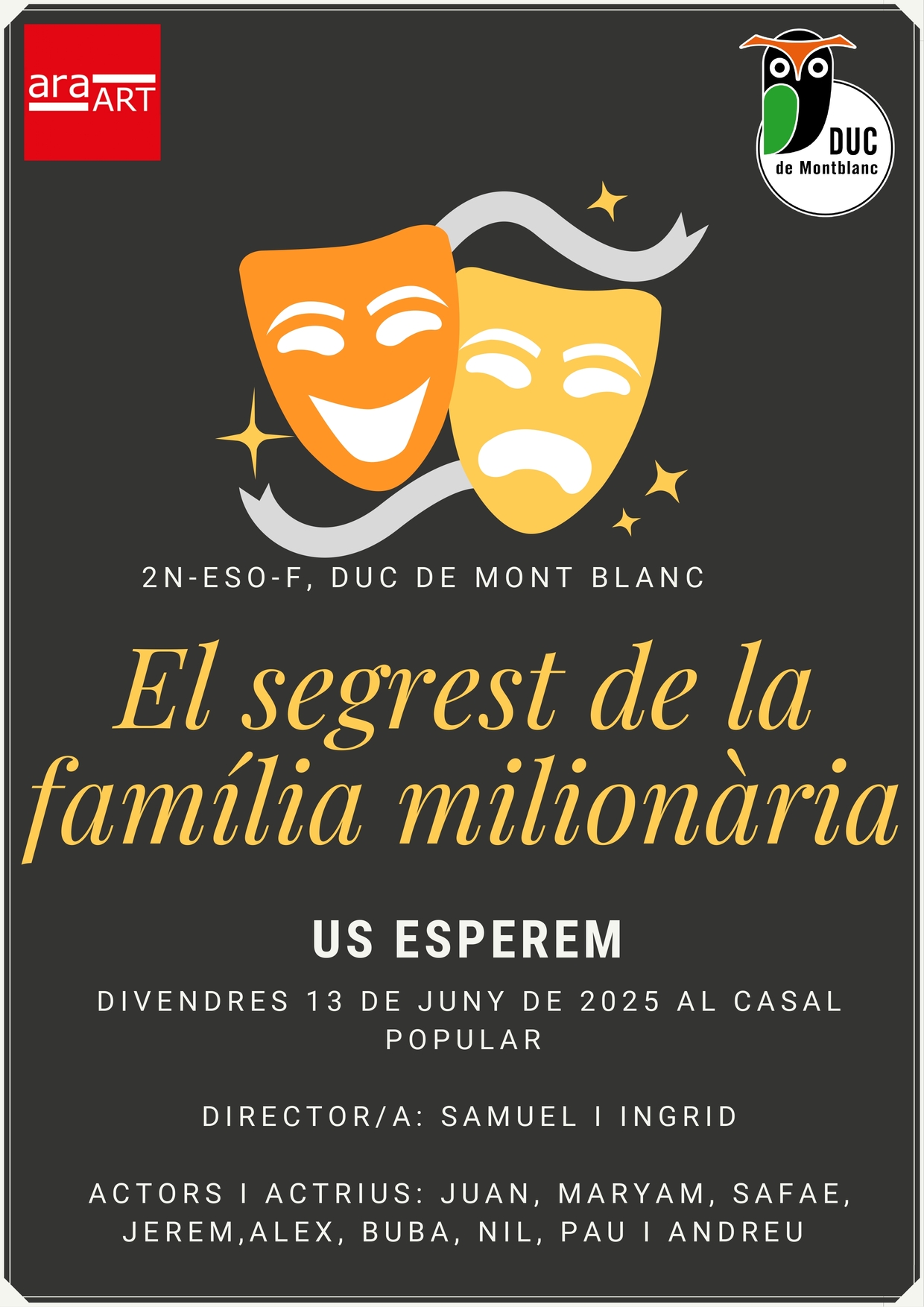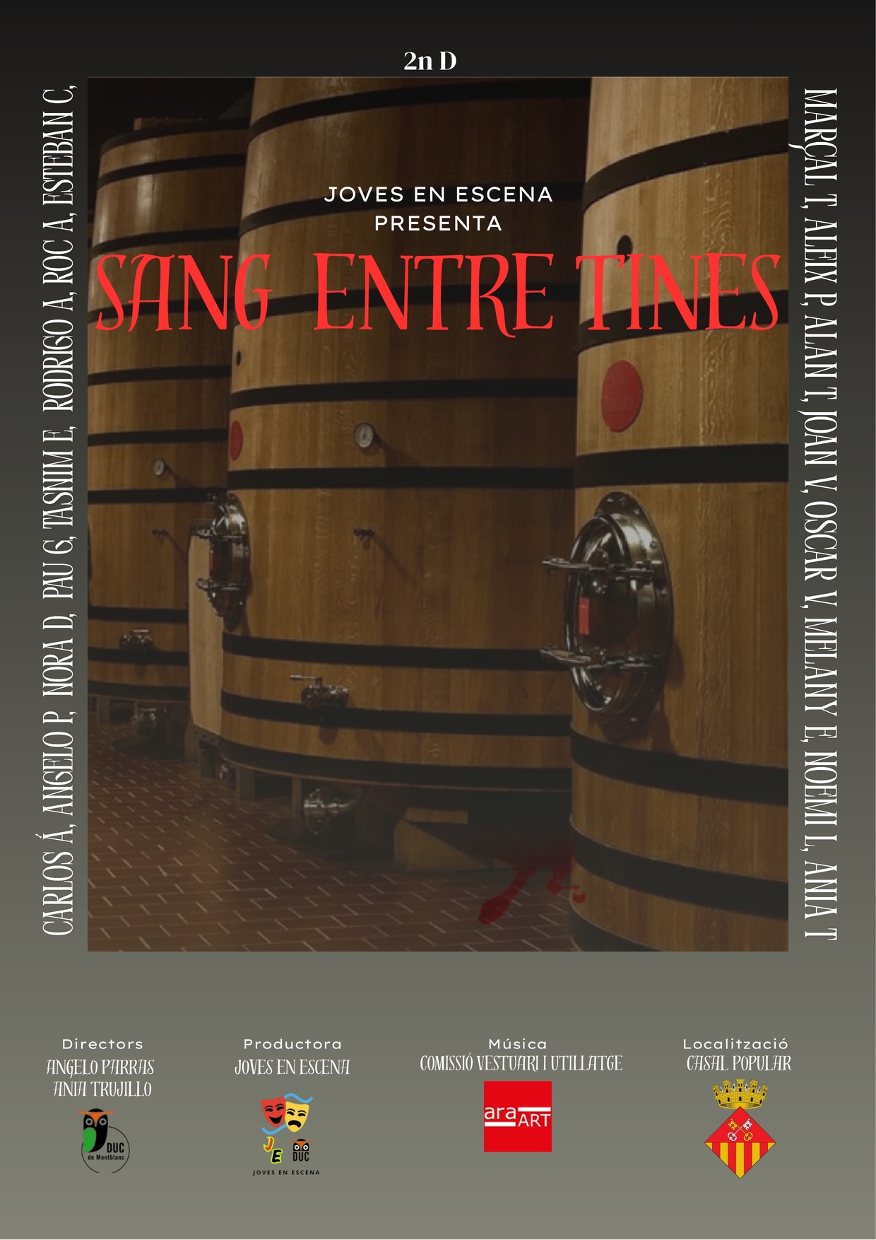 El procés ha estat complet, ja que han fet des del guió fins a la posada en escena, passant per l’escenografia, el vestuari i, fins i tot, la promoció. De fet, com a part del treball, els alumnes han dissenyat els seus propis cartells promocionals, que avui volem compartir com a mostra del seu talent i esforç.