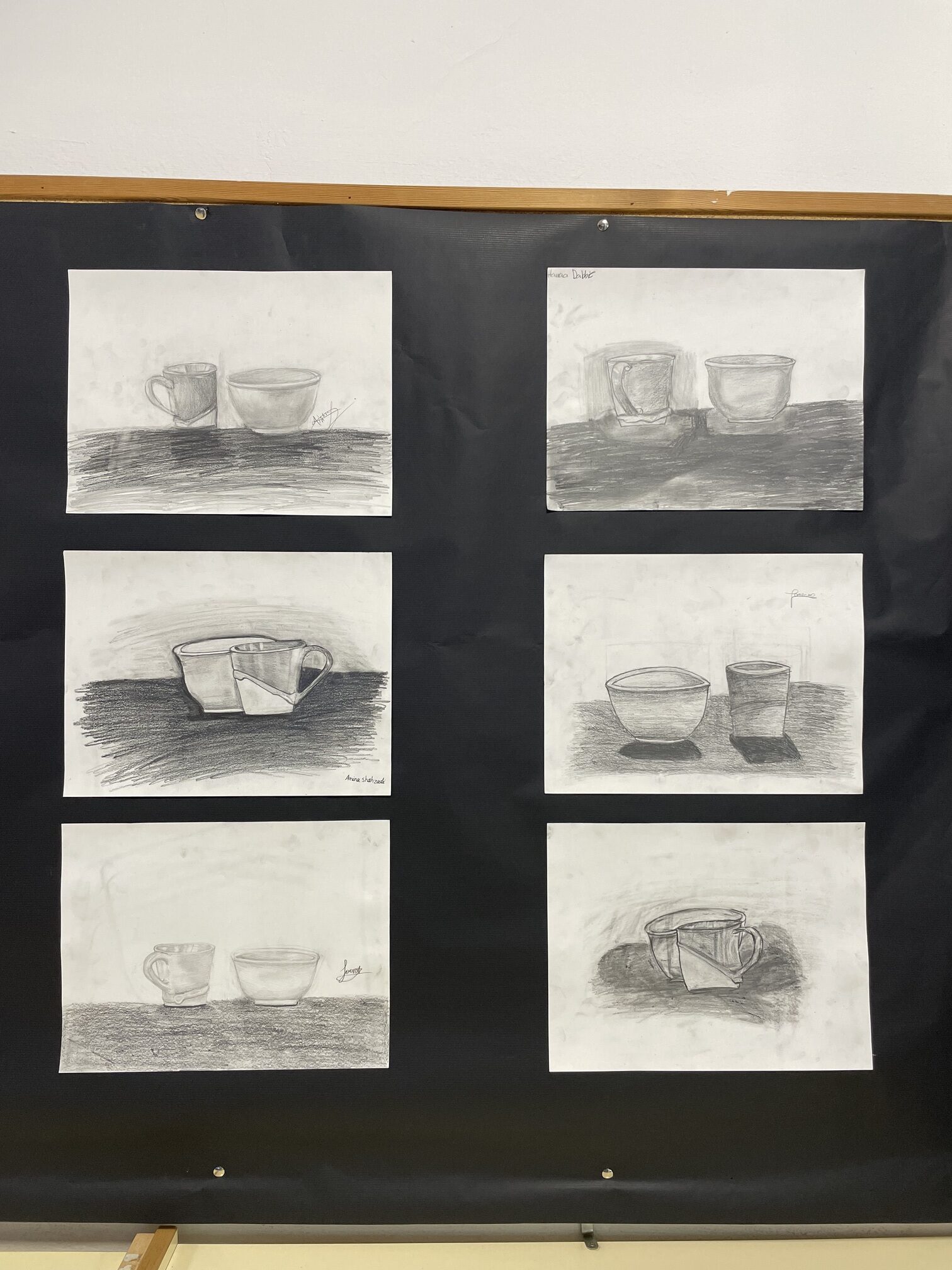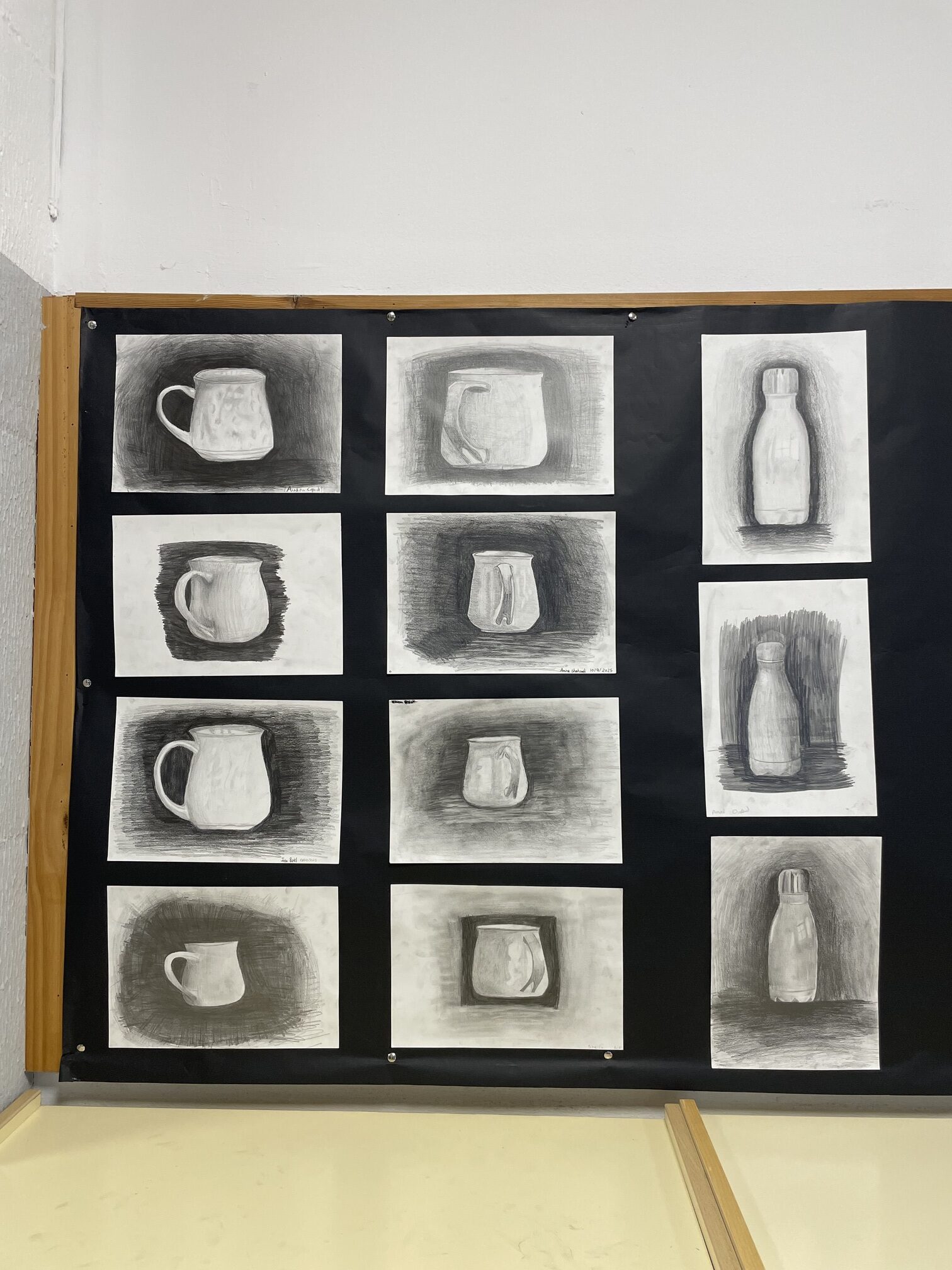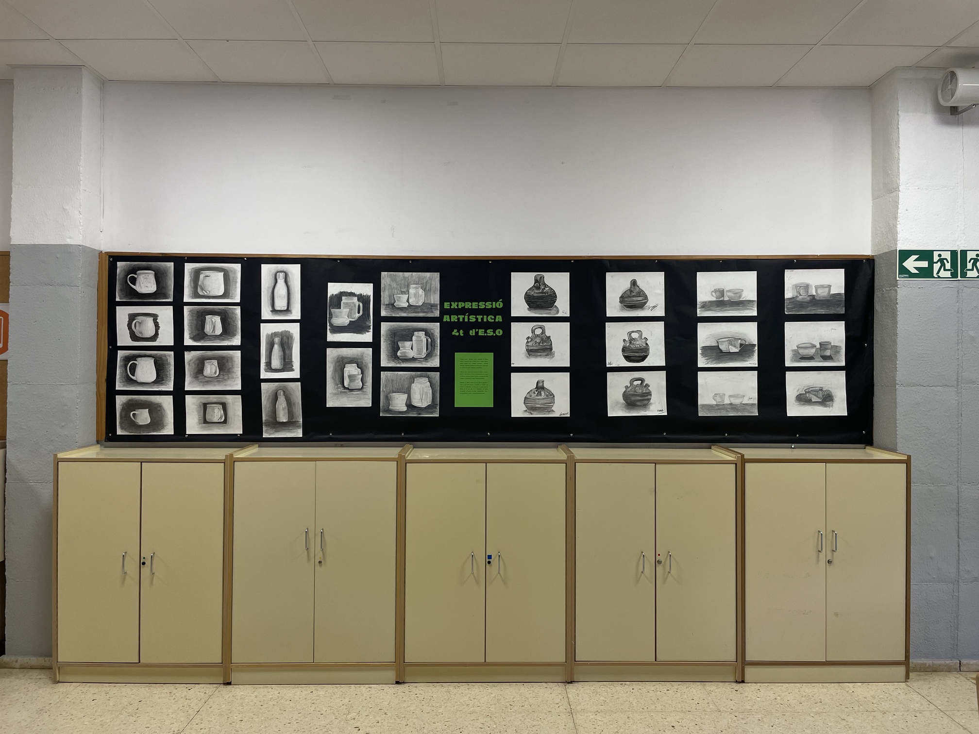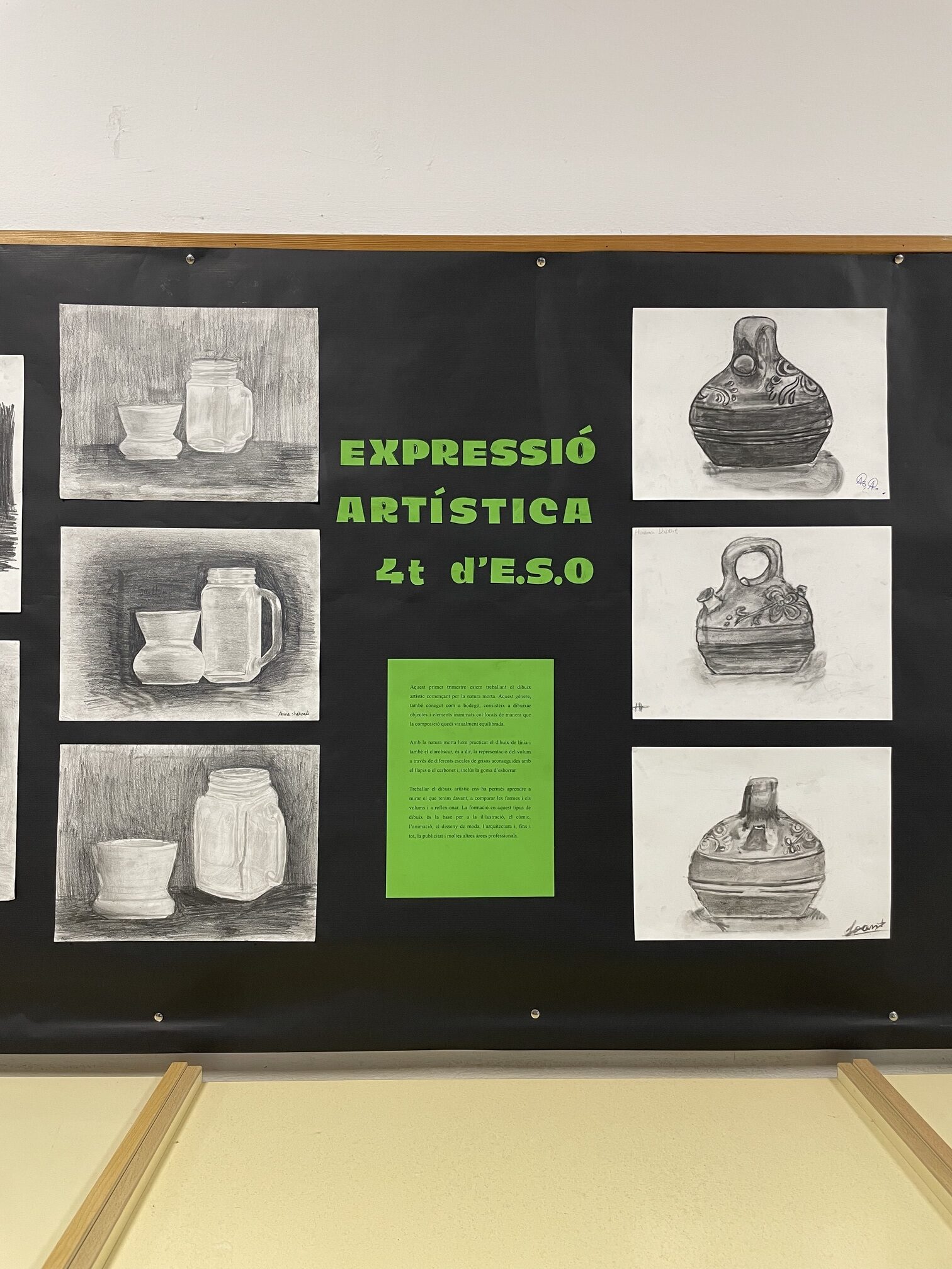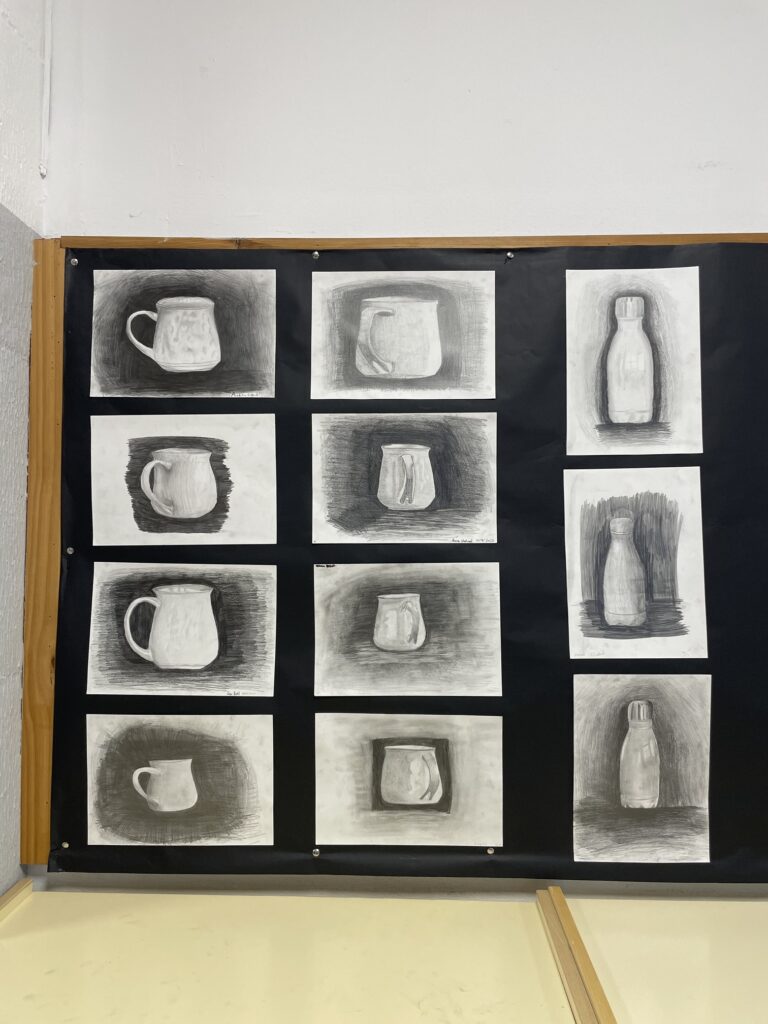 Aquests dies, a la sala d’actes del Duc, podeu visitar una exposició amb els dibuixos fets per l’alumnat de l’optativa d’Expressió Artística de 4t d’ESO. La mostra presenta una àmplia varietat de treballs elaborats amb llapis i carbonet, en què es representen objectes quotidians com tasses, ampolles o càntirs, i diverses composicions de bodegons.