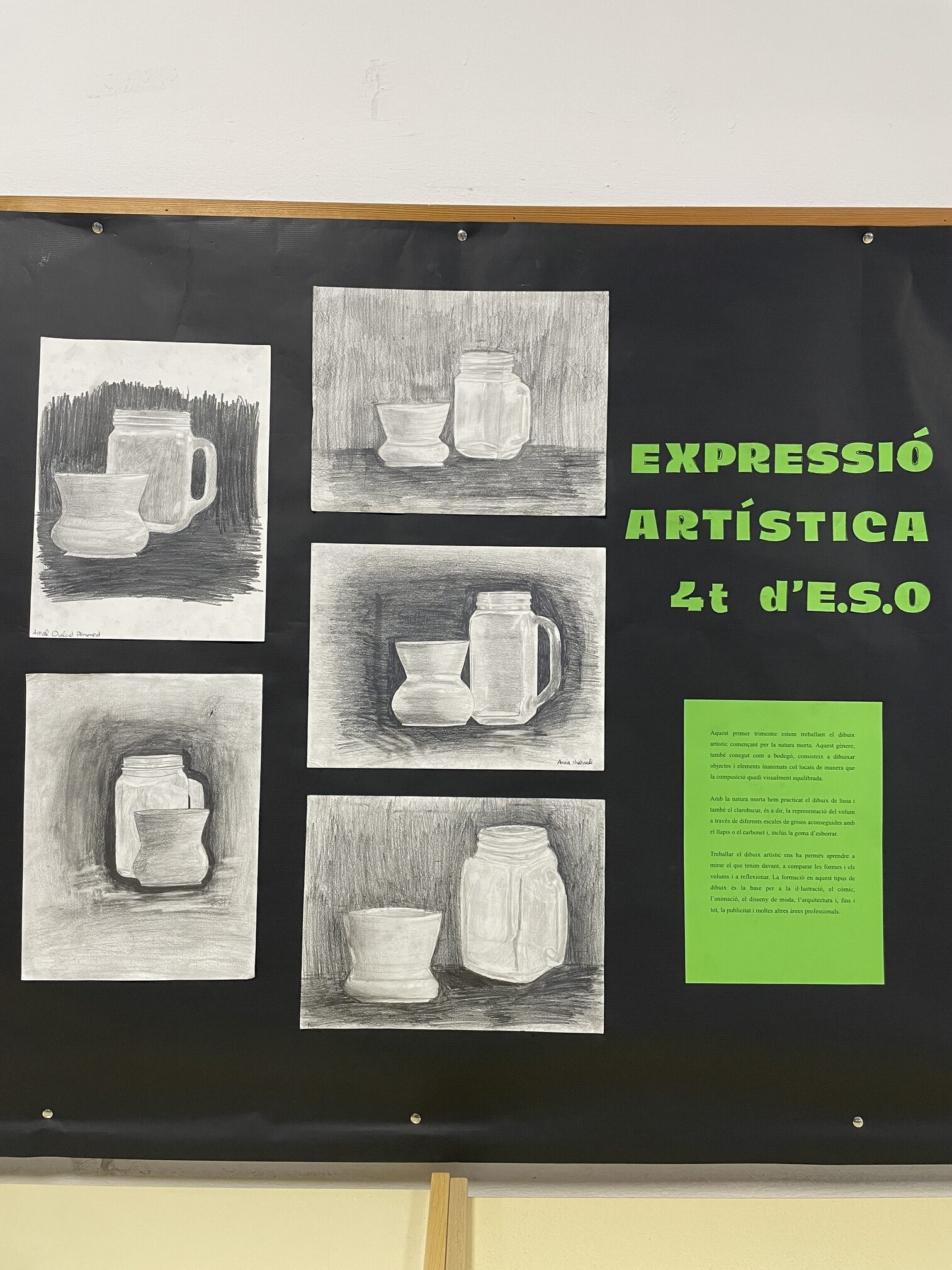 Aquesta exposició és la cloenda del primer tema treballat a l’optativa, dedicat al clarobscur i a la representació d’objectes en composicions de natura morta. Us convidem a passejar-vos per la sala d’actes i gaudir de les creacions dels companys i companyes, que demostren sensibilitat artística, observació i una gran capacitat tècnica. No us la perdeu!