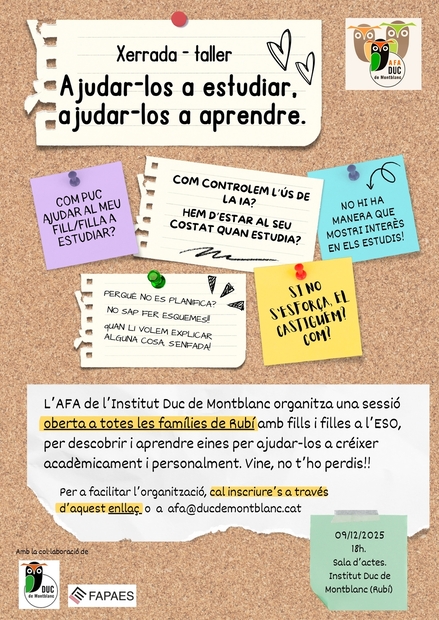 El pròxim dimarts, 9 de desembre de 2025, a les 18 h, se celebrarà la xerrada-taller Ajudar-los a estudiar, ajudar-los a aprendre a la sala d’actes del Duc. Aquesta activitat organitzada per l’AFA està adreçada a totes les famílies de Rubí amb fills i filles que cursen l’ESO.