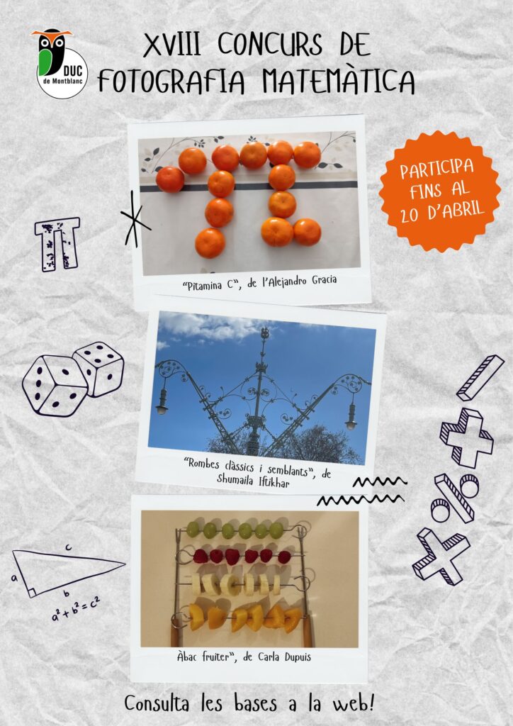 Ja està en marxa una nova edició del Concurs de Fotografia Matemàtica de l’Institut Duc de Montblanc! Aquest concurs, que arriba a la seva 18a edició, està obert a alumnes, professors/es, personal no docent i familiars de l’alumnat.