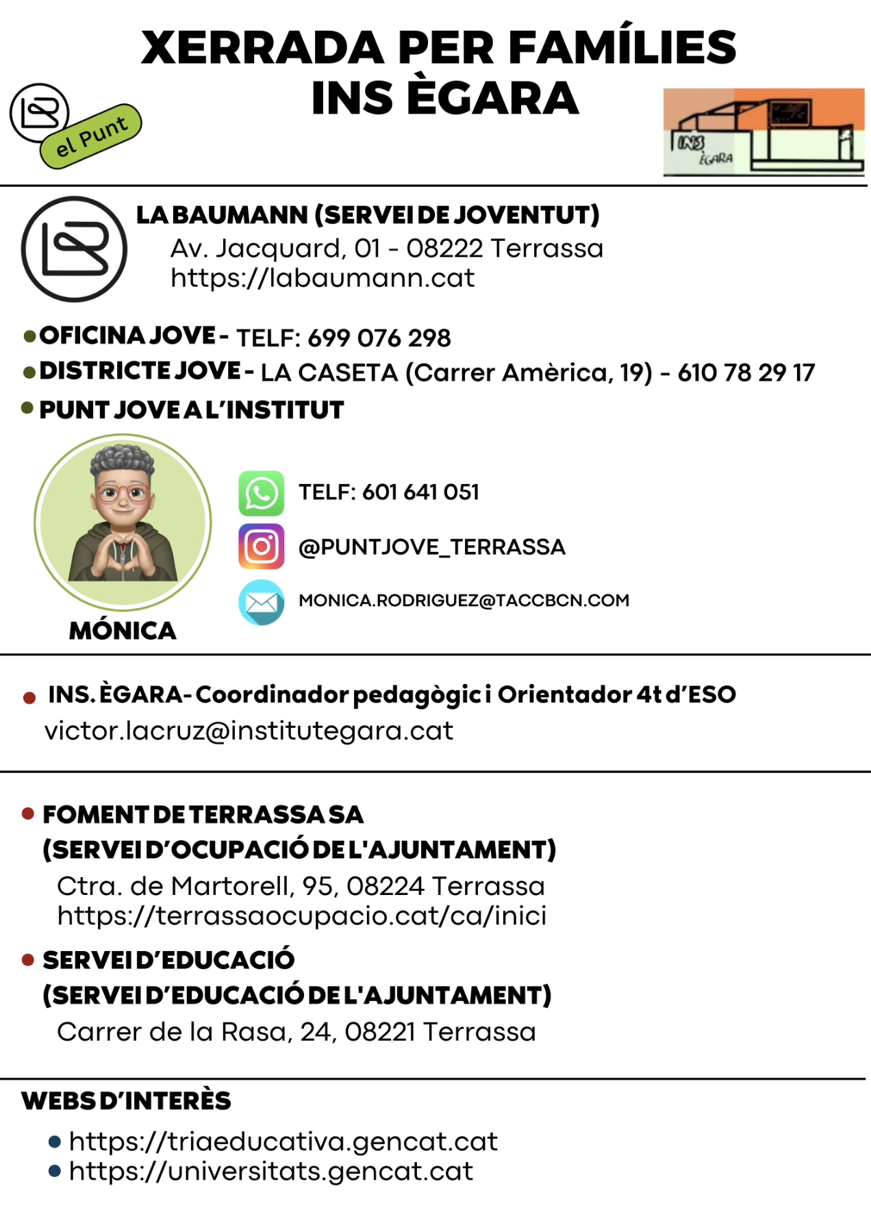 La xerrada la portaran entre la Mónica Rodríguez, orientadora que treballa a la Casa Baumann i que és la referent del PUNT JOVE a l’institut, i els orientadors de 4t d’ESO: Paula Montilla i Víctor Lacruz.
