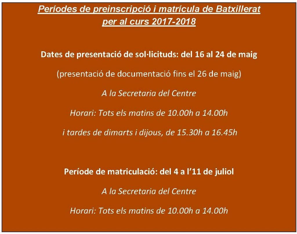 Matrícula 2017-2018 alumnat d’ESO nou al centre Llegeix més »