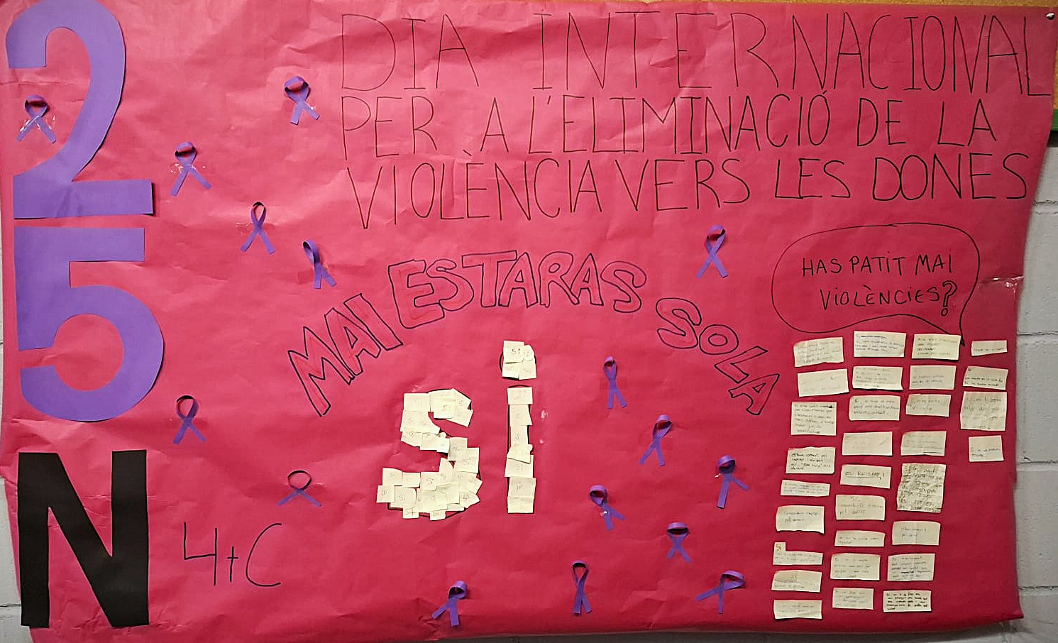 - Un cartell col·laboratiu, elaborat amb la participació voluntària de l’alumnat de 3r i 4t, que han respost a la pregunta: “Mai has viscut una situació de violència?”