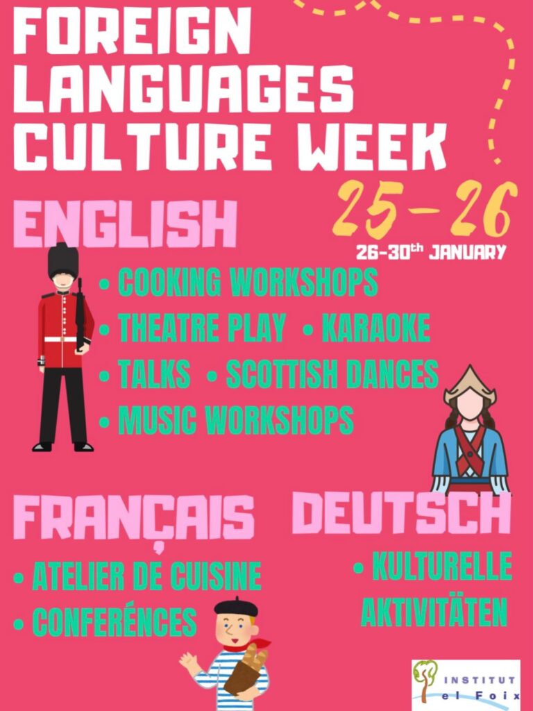 Del 25 al 30 de gener, l’Institut el Foix s’omple de colors, sons i sabors d’arreu del món amb la celebració de la Setmana de les Llengües Estrangeres. Aquesta iniciativa, impulsada pel departament de llengües estrangeres, convida l’alumnat a viure una experiència immersiva plena d’activitats culturals, tallers i propostes lúdiques que giren entorn de l’anglès, el francès i l’alemany.
