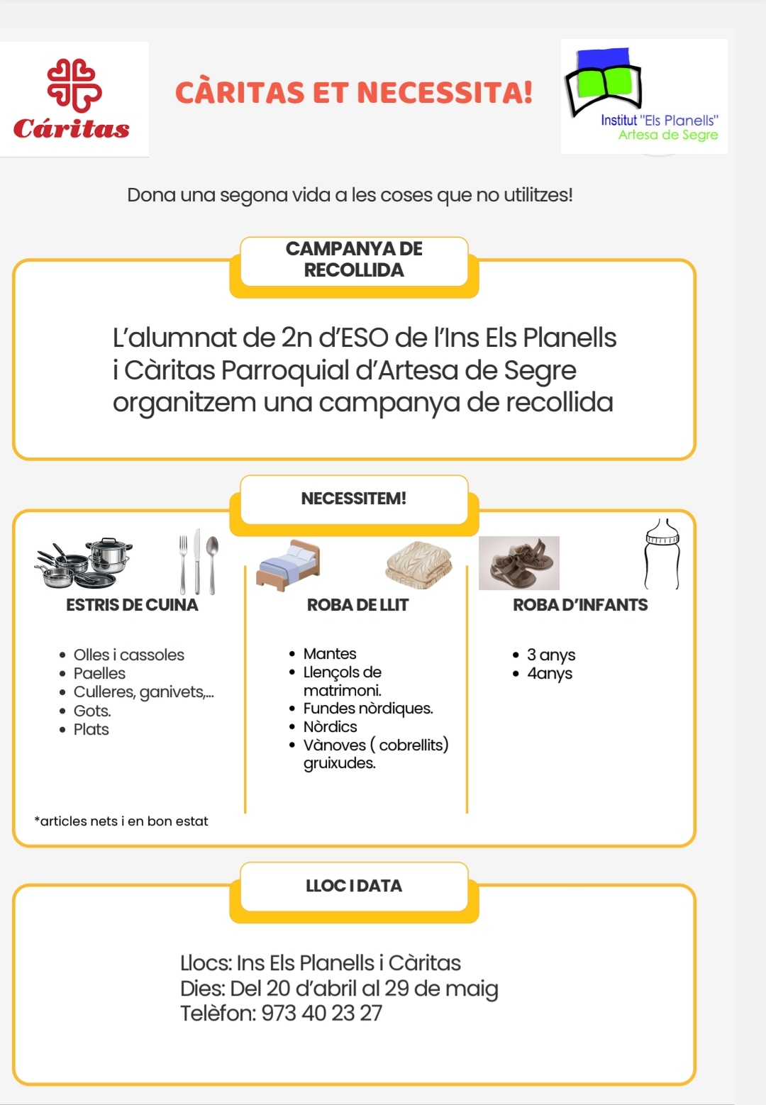 L’alumnat de 2n d’ESO de l’Institut Els planells i Càritas Parroquial d’Artesa de Segre organitzen una campanya de recollida d’estris de cuina, roba de llit i roba d’infant.… Llegeix més»
