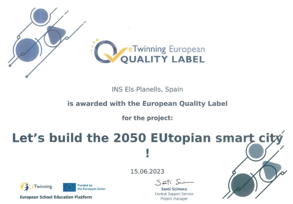 L’INS Els Planells rep el Segell de Qualitat Europeu (SQE) pel projecte eTwinning “Let’s build the 2050 EUtopian smart city” realitzat durant el curs 2021-2022 per l’alumnat de 3r d’ESO, dirigit per les professores Eva Vidal i Carme Pascual. Felicitats a tots els participants per l’esforç i la seva implicació!