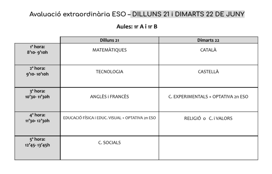 HORARI PROVES EXTRAORDINÀRIES admin17/06/21 Us adjuntem aquí l’horari de les proves extraordinàries dels dies 21 i 22 de juny. També us informen que els autocars vindran abans a buscar a l’alumnat: – Dilluns a les 14h. – Dimarts a les 12:30h.