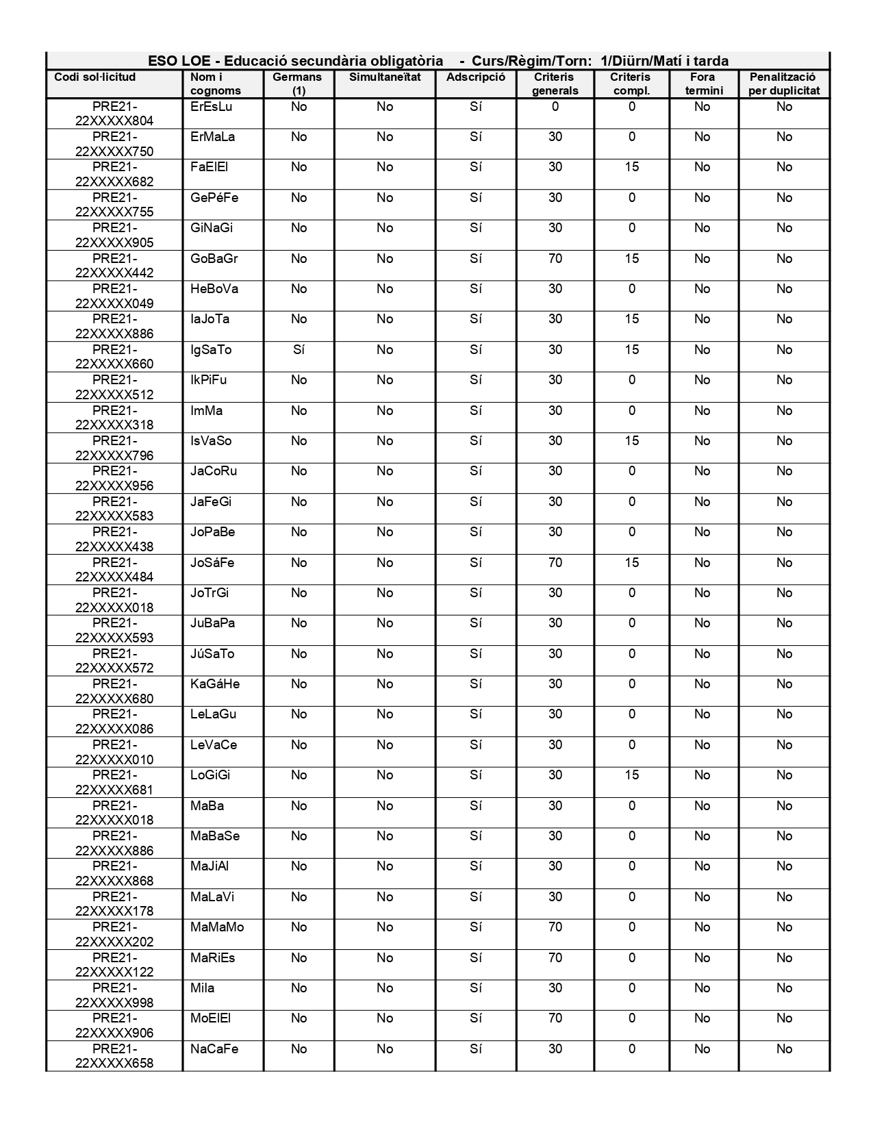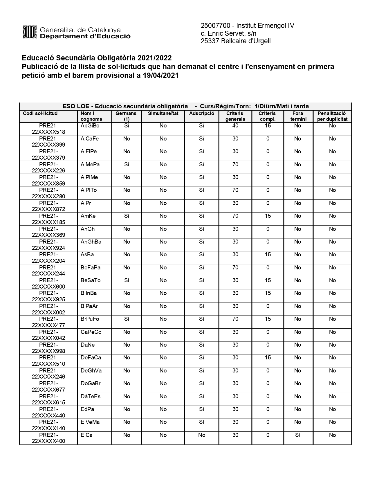 A continuació es mostren les puntuacions provisionals de la sol·licitud de preinscripció de 1r d’ESO corresponent al proper curs 2021-2022.