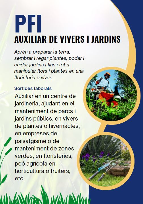 Mòduls de formació professional: Són els continguts tècnics propis de l’ofici que es vol aprendre. En un PFI hi ha diversos mòduls pràctics on s’ensenyen les tasques i coneixements bàsics de la professió. Per exemple, en un perfil de jardineria es fan mòduls sobre cultiu de plantes i manteniment de jardins, i en un perfil elèctric, mòduls d’instal·lacions elèctriques i de telecomunicacions. A més, tots els PFI inclouen un petit projecte integrat on l’alumne aplica el que ha après, i un mòdul de prevenció de riscos laborals bàsic.