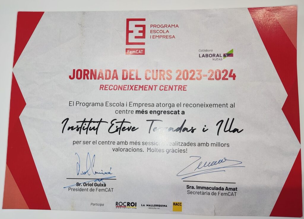 L’Institut Esteve Terradas i Illa, en el marc de la trobada anual del programa Escola i Empresa que desenvolupa FemCat, ha estat reconegut per la seva trajectòria en l’impuls de l’emprenedoria entre el seu alumnat.