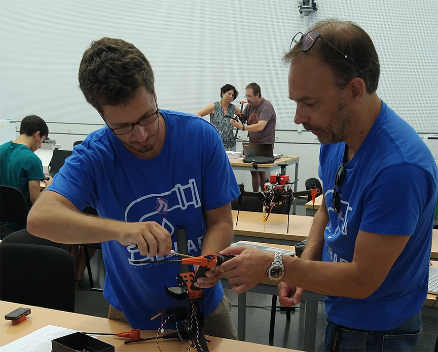 Durant tres dies, amb l’ajuda dels professor Miguel Valero i Pablo Royos de l’Escola d’Enginyeria Aeronàutica i Telecomunicacions (EEATC) de Castelldefels, han realitzat el muntatge d’un drone, l’han configurat i l’han fet volar en el DroneLab.