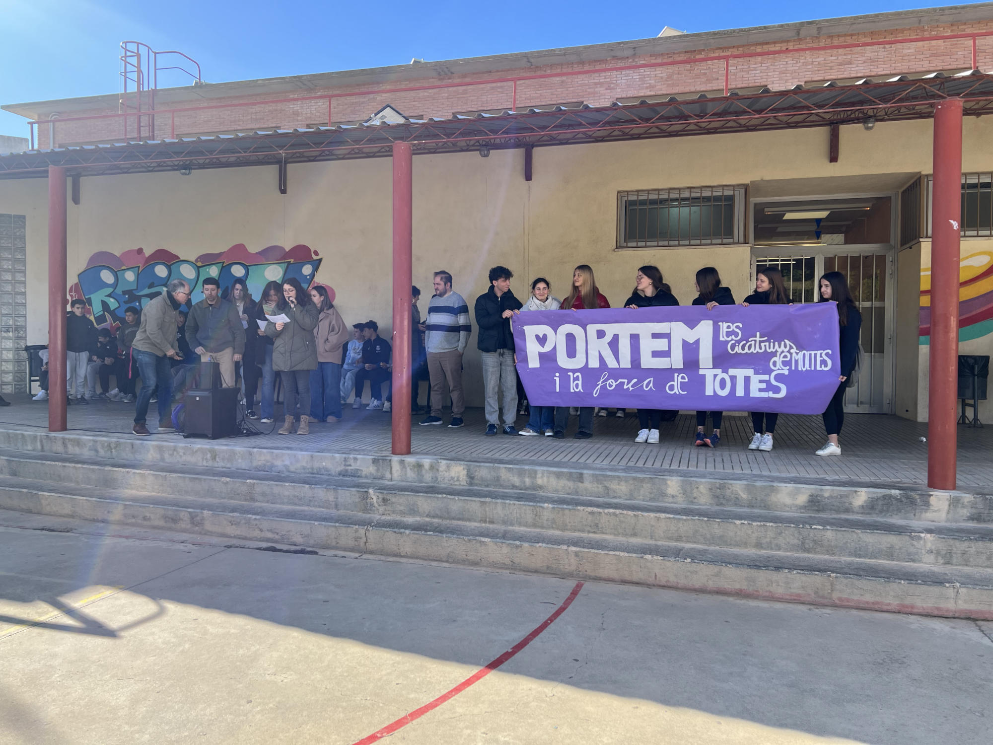 Aquest 25 de novembre, Dia Internacional per a l’Eliminació de la Violència vers les Dones, l’Institut de Flix ha volgut sumar-se en els actes de conscienciació envers aquesta xacra. D’aquesta manera, i a l’hora del pati, una representació de dones docents del centre ha llegit el manifest institucional d’aquest 25-N i s’ha desplegat una pancarta on es podia llegir ‘Portem les cicatrius de moltes i la força de totes’; una creació dels i les alumnes de segon de Batxillerat juntament amb l’alumnat del PFI. Així mateix, una alumna de 4t ha llegit un dels textos treballats a l’assignatura d’Ecos de 3r d’ESO sobre la temàtica. La jornada ha acabat penjant la pancarta al passadís de 1r d’ESO de l’institut perquè el missatge no resti en l’oblit i en memòria i suport a totes les víctimes.