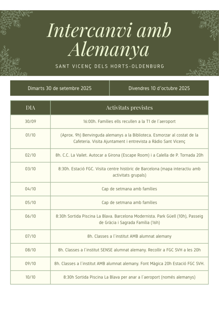 Entre els dies 30 de setembre i el 10 d’octubre rebrem al centre la visita dels companys i companyes d’aquesta ciutat de la Baixa Saxònia, que es troba a les ribes del riu Hunte, a 41 km de la ciutat de Bremen. Es tracta del quart intercanvi que fem amb ells des del 2019, i aquest any estarà farcit d’activitats d’allò més interessants, com ara una visita al centre històric de Barcelona i a alguns dels seus monuments més emblemàtics o una excursió fins a Girona i Calella. A la imatge podeu consultar el programa sencer.