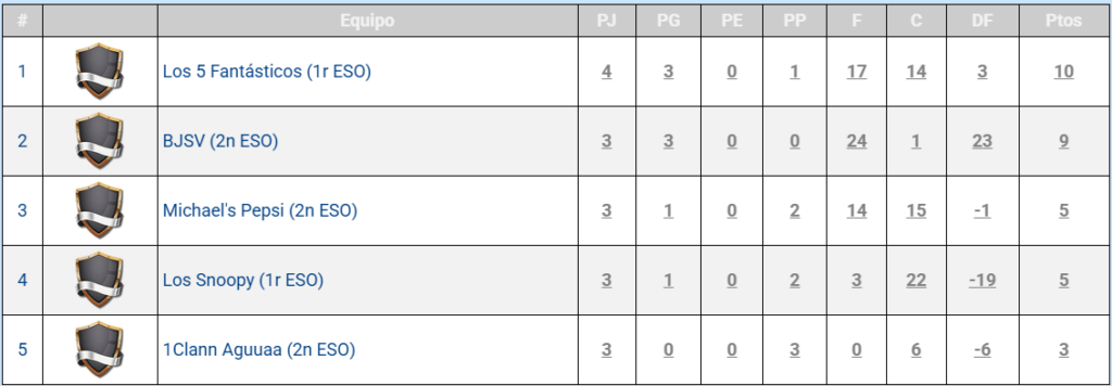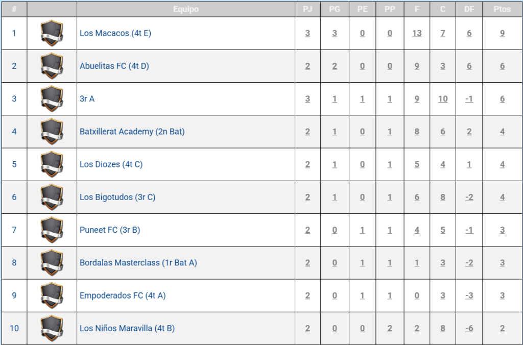 Quant a la lliga de Futbol Sala de 2n cicle d’ESO i batxillerat, destaquem que és la lliga que va més endarrerida, ja que la majoria d’equips han jugat només dos partits. La raó és que es tracta de la lliga on hi ha més participació i, a sobre, s’han ajornat alguns partits per la pluja. Destaquen els equips de “Los Macacos” de 4t E i “Abuelitas FC” de 4t D, els quals encara no han perdut cap partit. Podeu consultar la classificació completa a la següent imatge.