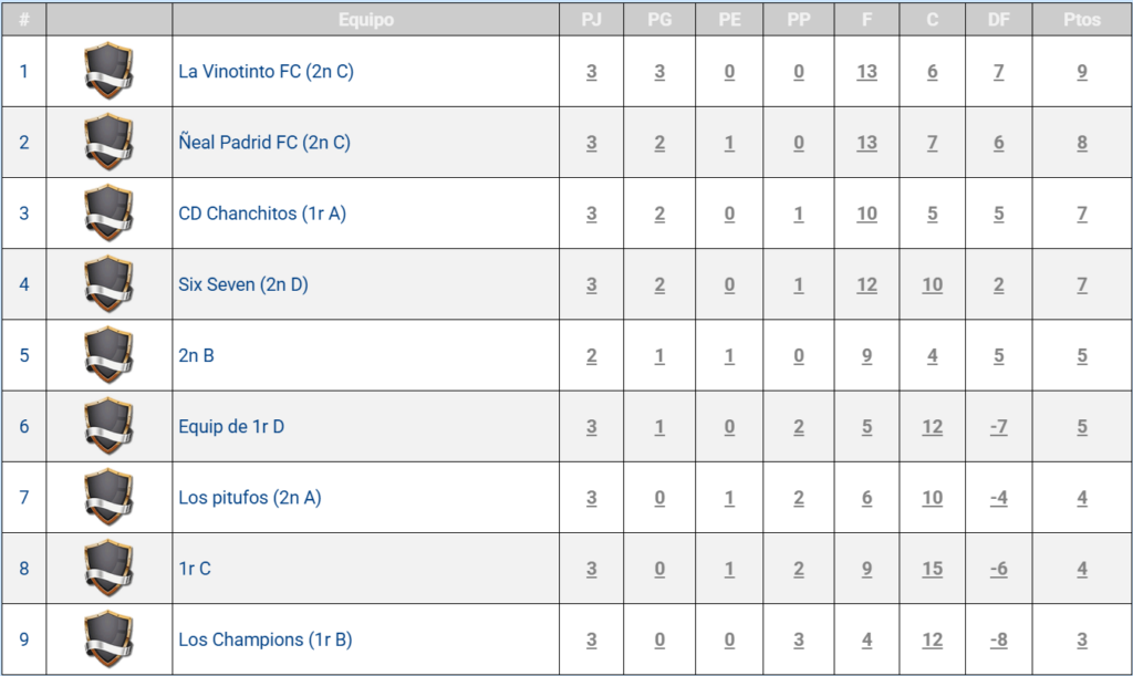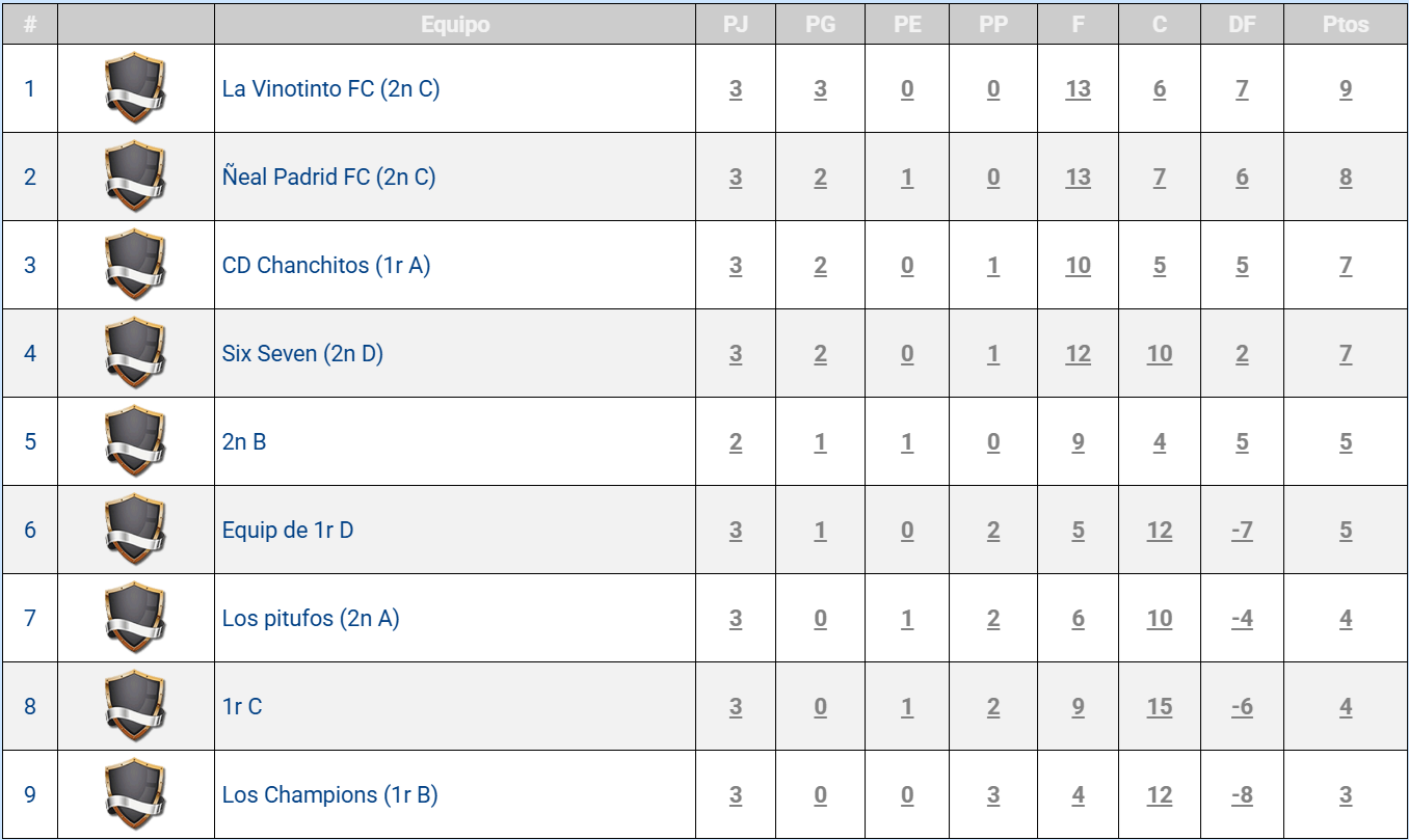 Pel que fa a la lliga de futbol sala de primer cicle d’ESO destaca en primera posició l’equip de 2n C, “La Vinotinto FC”, que es manté invicte amb tres partits guanyats. El segueixen de ben a prop l’altre equip de 2n C, “Ñeal Padrid FC” i “Los Chanchitos” de 1r A. Podeu consultar la classificació completa a la següent imatge.
