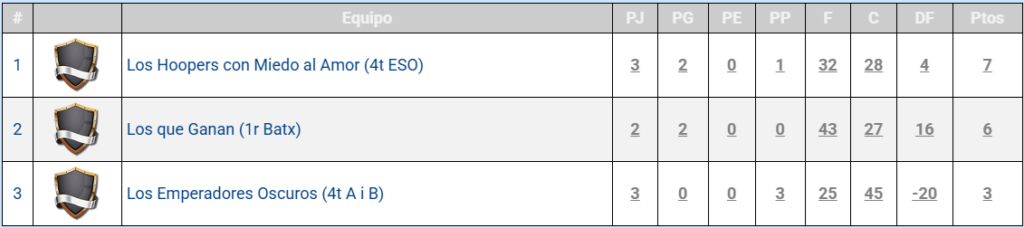 En darrer lloc, en la lligueta de bàsquet del 2n cicle d’ESO i Batxillerat s’han completat 4 jornades, ja que és la lliga on trobem menys equips. Destaca en primera posició l’equip de 4t d’ESO “Los Hoopers con miedo al amor”, tot i això, l’equip invicte és l’equip de 1r de Batxillerat, amb dues victòries. Podeu consultar la classificació completa a la següent imatge.