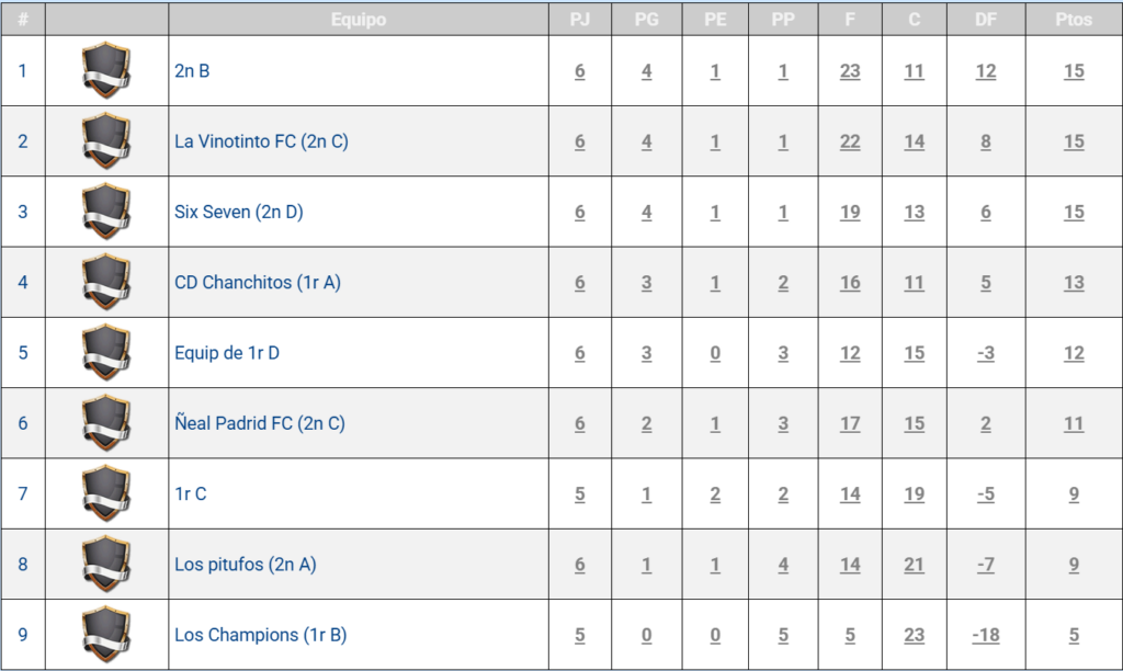 Pel que fa a la lliga de futbol sala de primer cicle d’ESO, hi ha hagut un canvi en les primeres posicions. Hi trobem un triple empat a punts entre els equips de 2n B, 2n C i 2n D, tots amb 4 partits guanyats, un empatat i un perdut. Podeu consultar la classificació completa a la següent imatge.