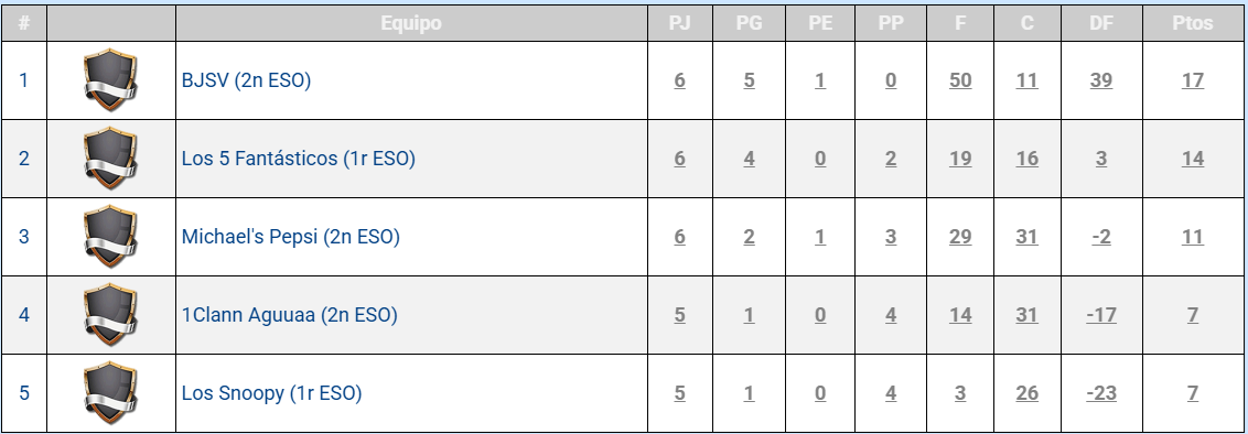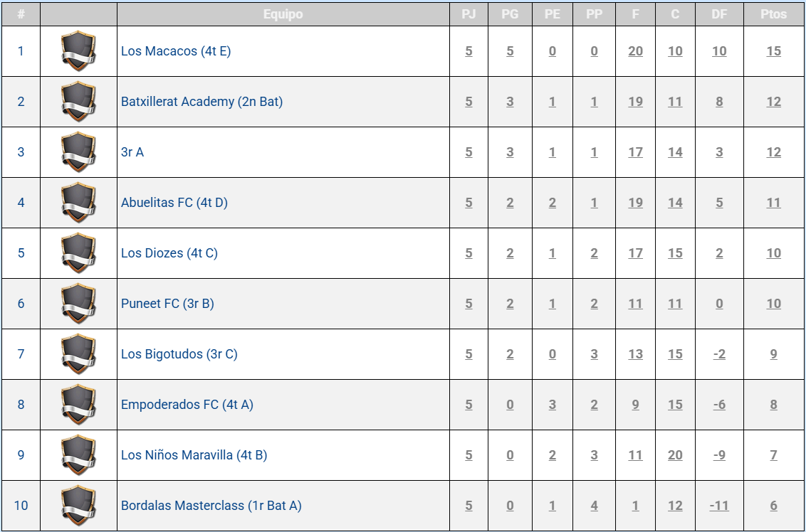 Quant a la lliga de Futbol Sala de 2n cicle d’ESO i batxillerat, destaca l’equip de “Los Macacos” de 4t E, que es manté invicte amb 5 partits guanyats. El segueixen a 3 punts de distància l’equip de 2n de Batxillerat “Batxillerat Academy” i l’equip de 3r A. Podeu consultar la classificació completa a la següent imatge.