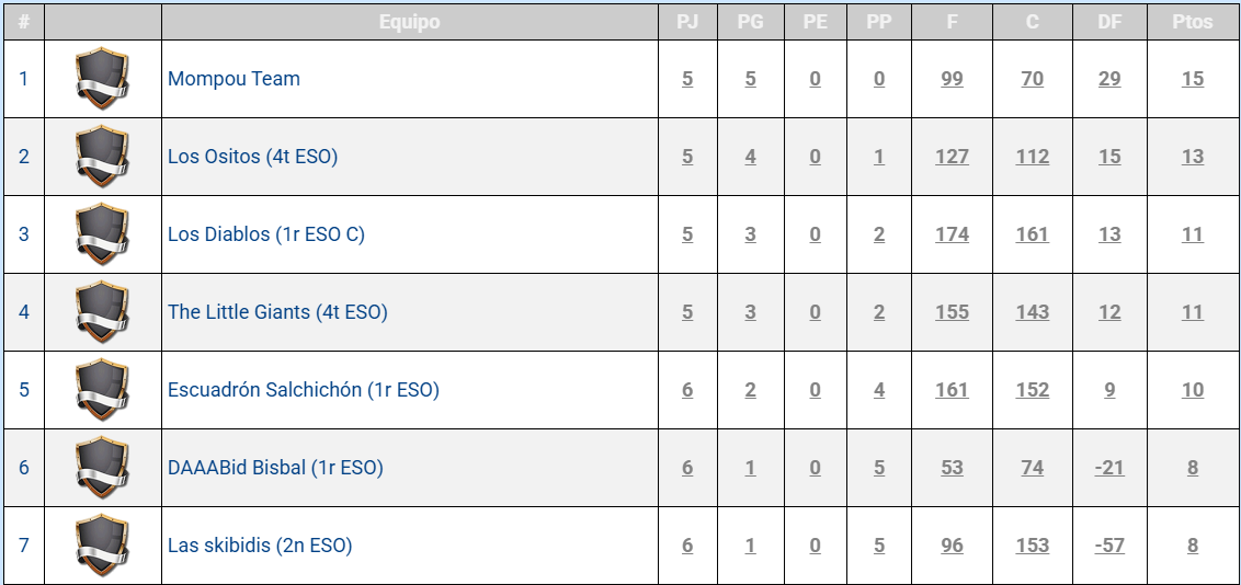 Amb relació a la lliga de Voleibol, en aquesta actualització es pot observar de manera més real la classificació, ja que els equips líders tenen el mateix nombre de partits disputats. Destaca en primera posició el “Mompou Team”, l’equip de docents de l’institut que encara es manté invicte amb 5 partits guanyats. El segueixen els equips de 4t d’ESO “Los Ositos” i de 1r d’ESO “Los Diablos”. Podeu consultar la classificació completa a la següent imatge.