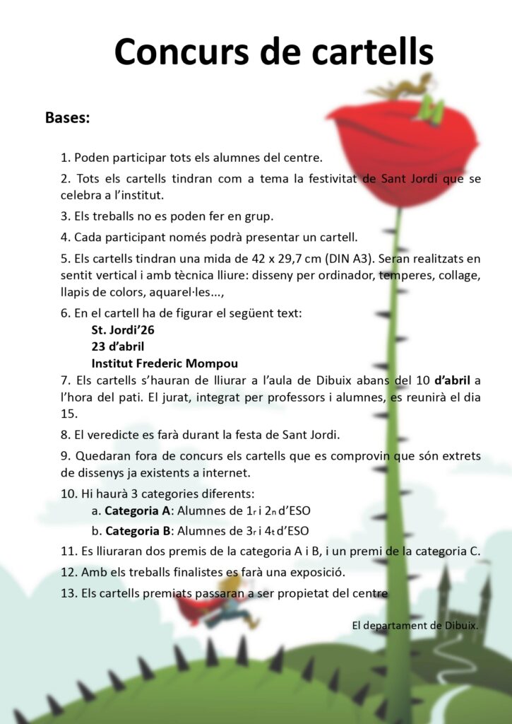 Com cada any pels volts de Sant Jordi, us fem saber que el dia 23 d’abril realitzarem una jornada emmarcada en la diada de Sant Jordi i celebrarem diversos concursos relacionats amb la festivitat: els Jocs Florals, el concurs popular de mems en català i el concurs de cartells.
