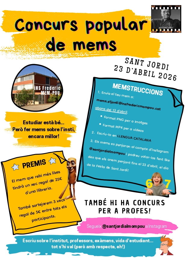 El concurs popular de mems és únicament en català i hi podeu participar fins al 13 d’abril, però us recomanem que envieu els mems abans, ja que els anirem penjant al llarg de tot el mes d’abril a la pàgina d’Instagram @santjordialmompou. Sigueu conscients que els guanyadors del concurs de mems s’escullen mitjançant votació popular: qui tingui més likes serà el mem guanyador, i no hi ha categories per grups d’edat.