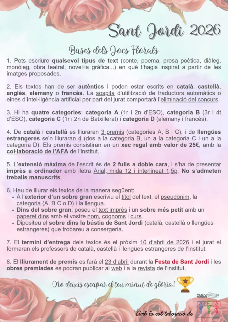 A les classes de llengües us explicarem més concretament les bases de cada concurs, però també us les pengem a la pàgina web perquè les pugueu consultar i animar-vos. Als Jocs Florals, hi haurà quatre categories: la categoria A (1r i 2n d’ESO), la categoria B (3r i 4t d’ESO), la categoria C (1r i 2n de Batxillerat) i la categoria D (alemany i francès).