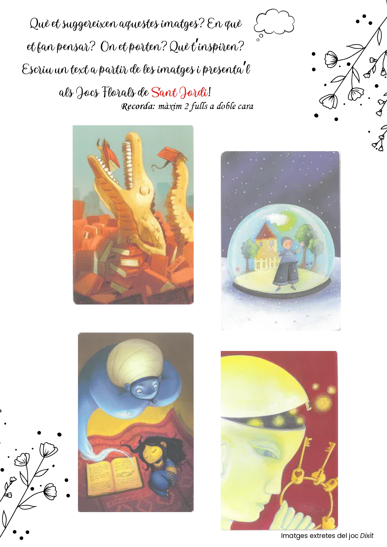 Recordeu que heu de complir els criteris formals i de contingut que consten als cartells de cada concurs. Com cada any, el concurs literari l’heu de desenvolupar a partir d’una de les quatre imatges que us proposem, aquest any seran cartes del joc de taula Dixit. La data límit per entregar els textos literaris és el 10 d’abril a una bústia que hi haurà a consergeria.